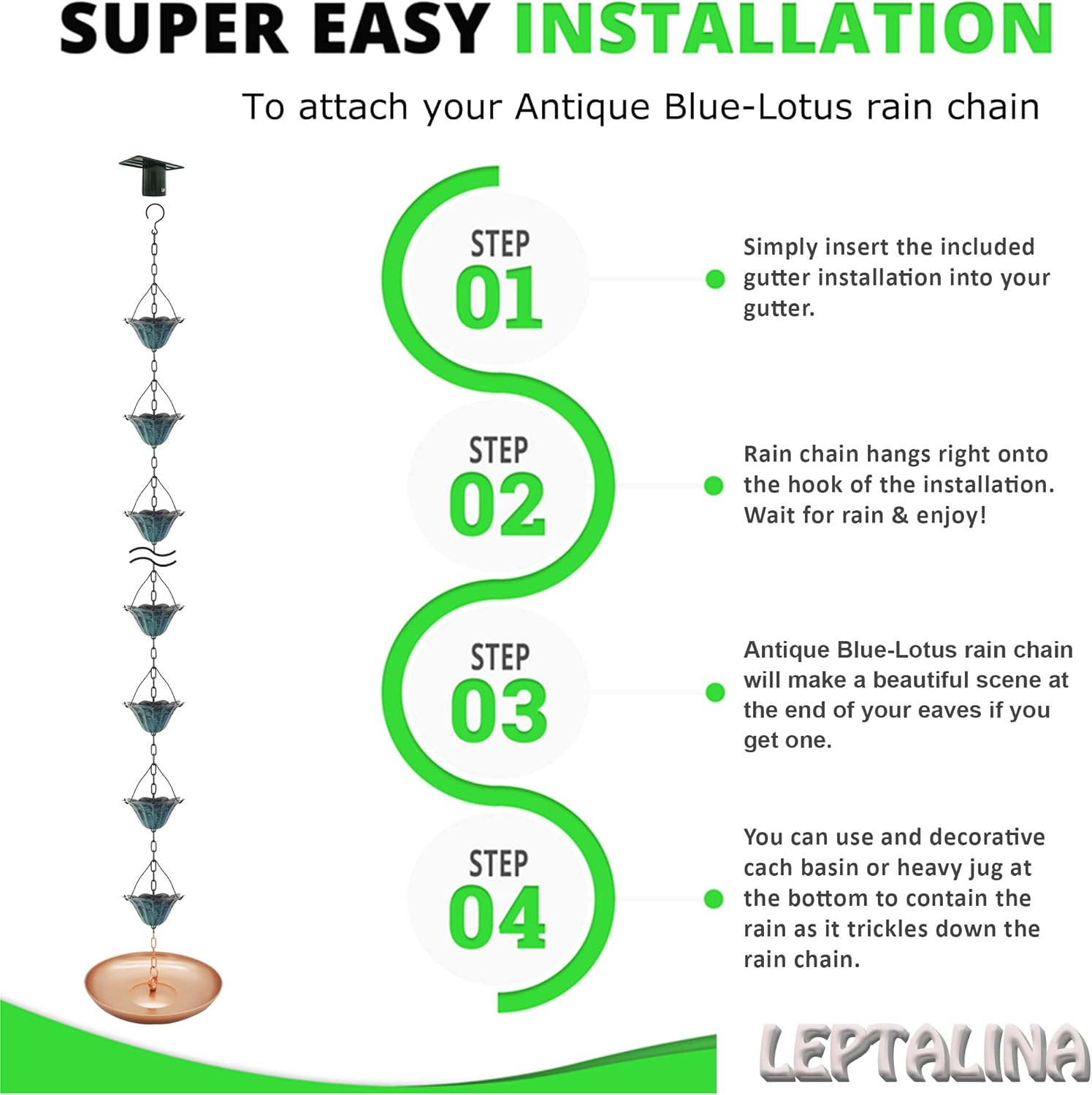 • 30-day money-back guarantee: Made from the highest-strength iron, the rain chain is durable and resistant. We’re convinced you will love how much these downspout chains will transform your garden decor, however, if you are not fully content, we will return it.