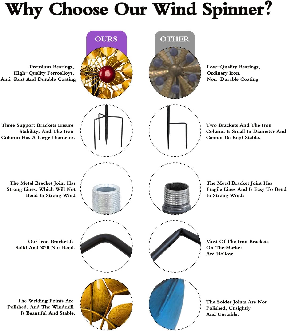 • High Quality Bearings: Wind Spinner use fine welding technology so that the gentle breeze can caused it to rotate smoothly 360°. Seal bearings to prevent water infiltration
