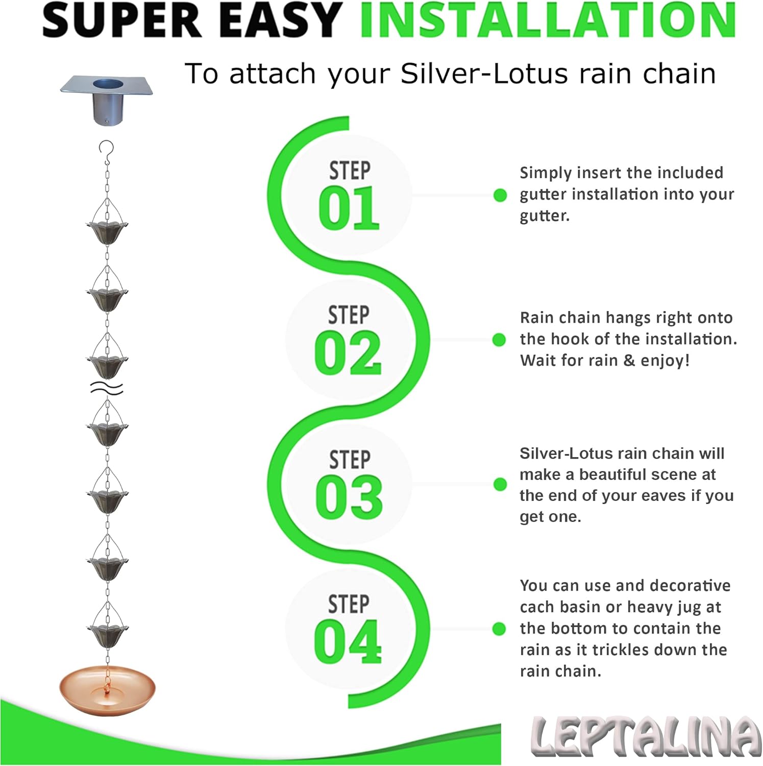 • Featuring 12 beautifully ornate lotus cups, our rain chain adds a chic touch to your roof, awning, or shed. Moreover, the rain chains are painted in a silver color, to perfectly complement your roof and garden decor.