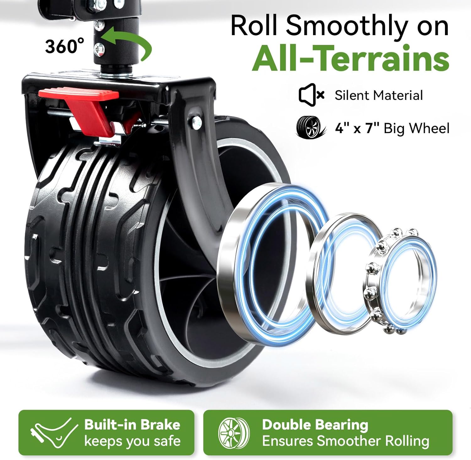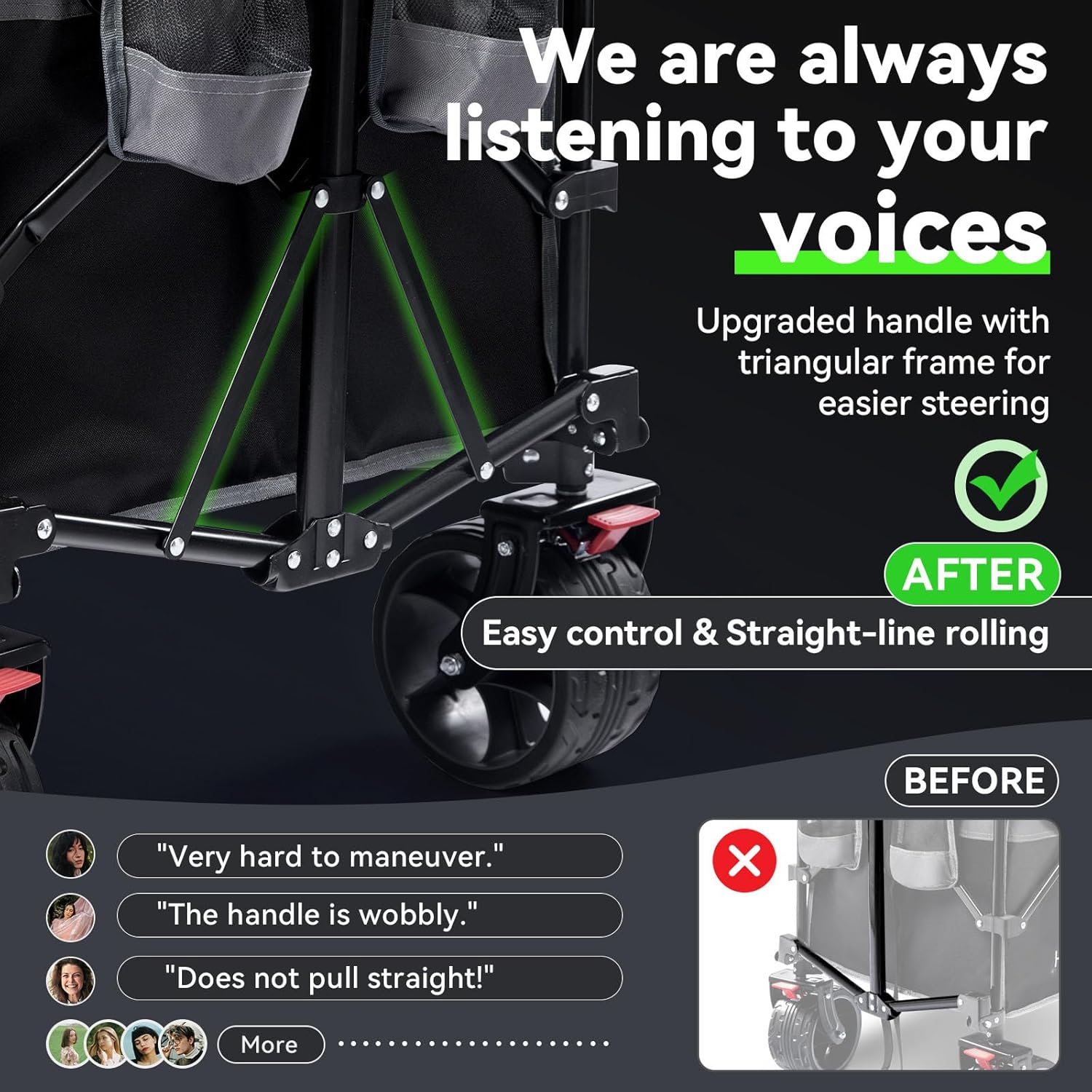 • 𝟐-π–πˆπƒπ„π‘ β—Ž 𝐔𝐏𝐆𝐑𝐀𝐃𝐄𝐃 𝐖𝐇𝐄𝐄𝐋𝐒 π‚πŽπππ”π„π‘ 𝐀𝐋𝐋 π“π„π‘π‘π€πˆππ’ - Super large 4" wheels with unique anti-slip pattern make our collapsible wagon extremely capable of transporting load on multiple terrains, including sandy beach, grass and even rough terrains. The wheels of our beach cart are significantly wider than similar folding carts, resulting in dramatically better steering. The dual front wheels are 360-degree rotatable for easy maneuvering.