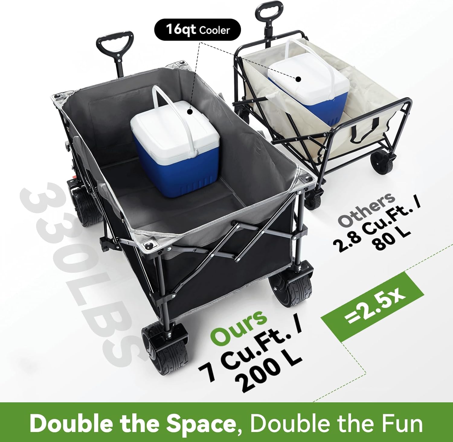• 𝟏-𝐋𝐀𝐑𝐆𝐄𝐑 ⇔ πŒπ€π˜ππ„ 𝐋𝐀𝐑𝐆𝐄𝐒𝐓 – You could hardly find a larger one. Our beach wagon is designed to be a real carryall. With a deeper and larger storage space, our wagon cart stands out from others thanks to its surprisingly enlarged capacity of 200L / 7 cubic feet, which means 3-4 times the capacity of a 24-inch suitcase or 5-7 times of a 20-inch suitcase. Just load it with everything you need and enjoy a nice adventure in the sun!