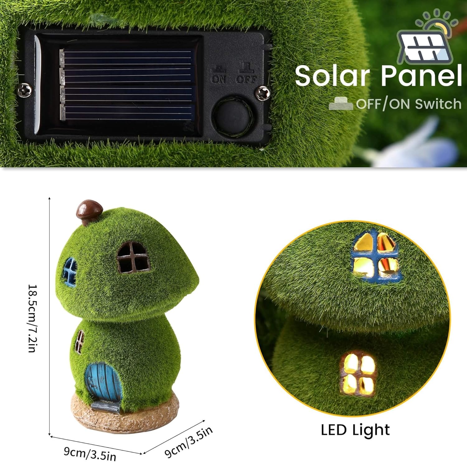 • The charming mushroom house statue is powered by a tiny solar panel at night, glowing warm white. Very beautiful fairy house outdoor solar lights is a wonderful addition to the garden, swimming pool, lawn.