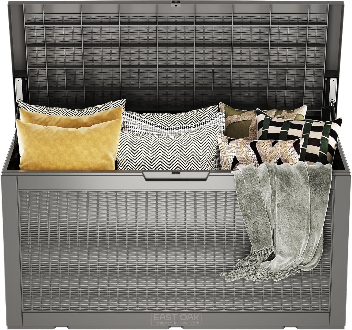 EAST OAK Outdoor Storage Box, 100 Gallon Deck Box, Waterproof Resin Storage Bench for Patio Cushions, Gardening Tools, Pool Accessories, Lockable, UV Resistant, Grey