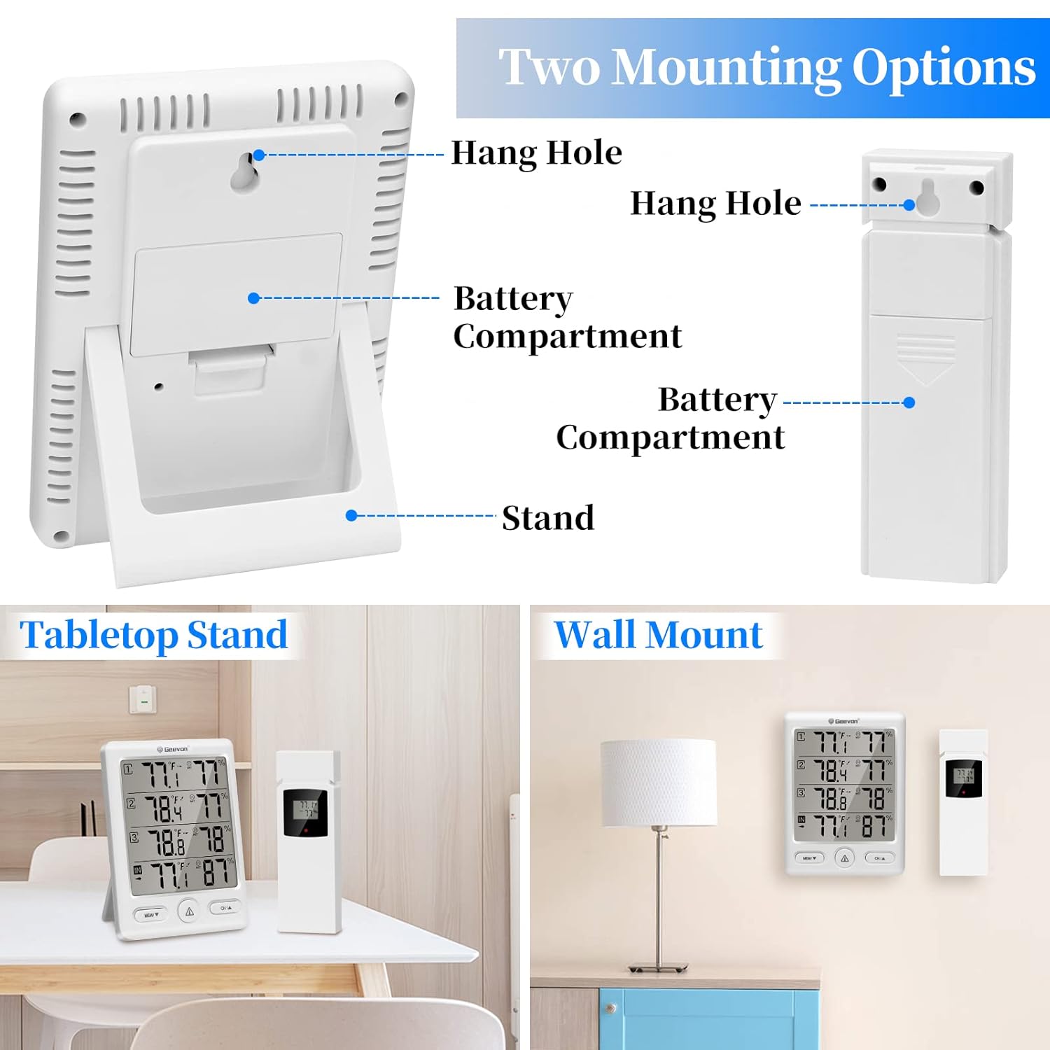 • 【Multiple Applications】Geevon 4 channel indoor outdoor thermometer can be placed on the desk or hung on the wall as you like. You can place it in your bedroom, baby room, wine cellar, basement, garden, greenhouse, grow tent, or office. The base station is powered by 2 AA Battery, and the remote sensor is powered by 2 AAA Battery(Not Included). Please let us know if there are any problems with the weather thermometers, we will do our best to solve the problem for you.