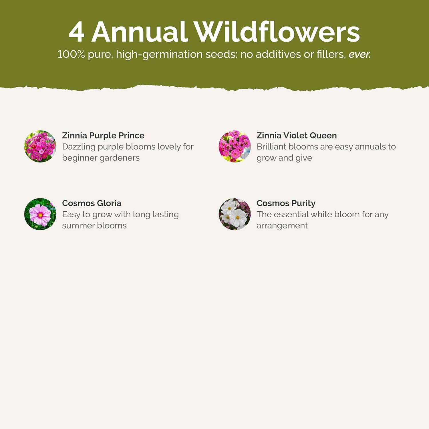 • 100% Pure, Non-GMO Seeds - No fillers, favorites only! Includes 4 easy-to-grow species: Zinnia Purple Prince, Zinnia Violet Queen, Cosmos Gloria, Cosmos Purity