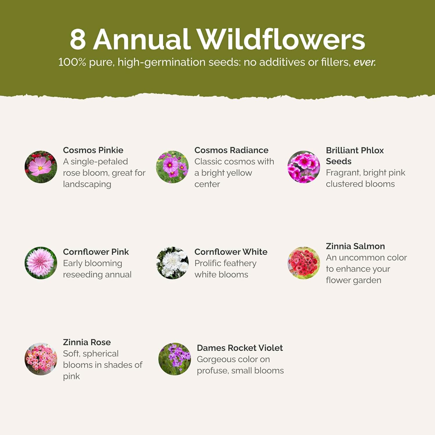 • 100% Pure, Non-GMO Seeds - No fillers, favorites only! Includes 9 easy-to-grow species: Cosmos Pinkie, Cosmos Radiance, Cosmos Purity, Pink Annual Phlox, Pink Cornflower, White Cornflower, Zinnia California Giant, Zinnia Light Pink, Dame's Rocket