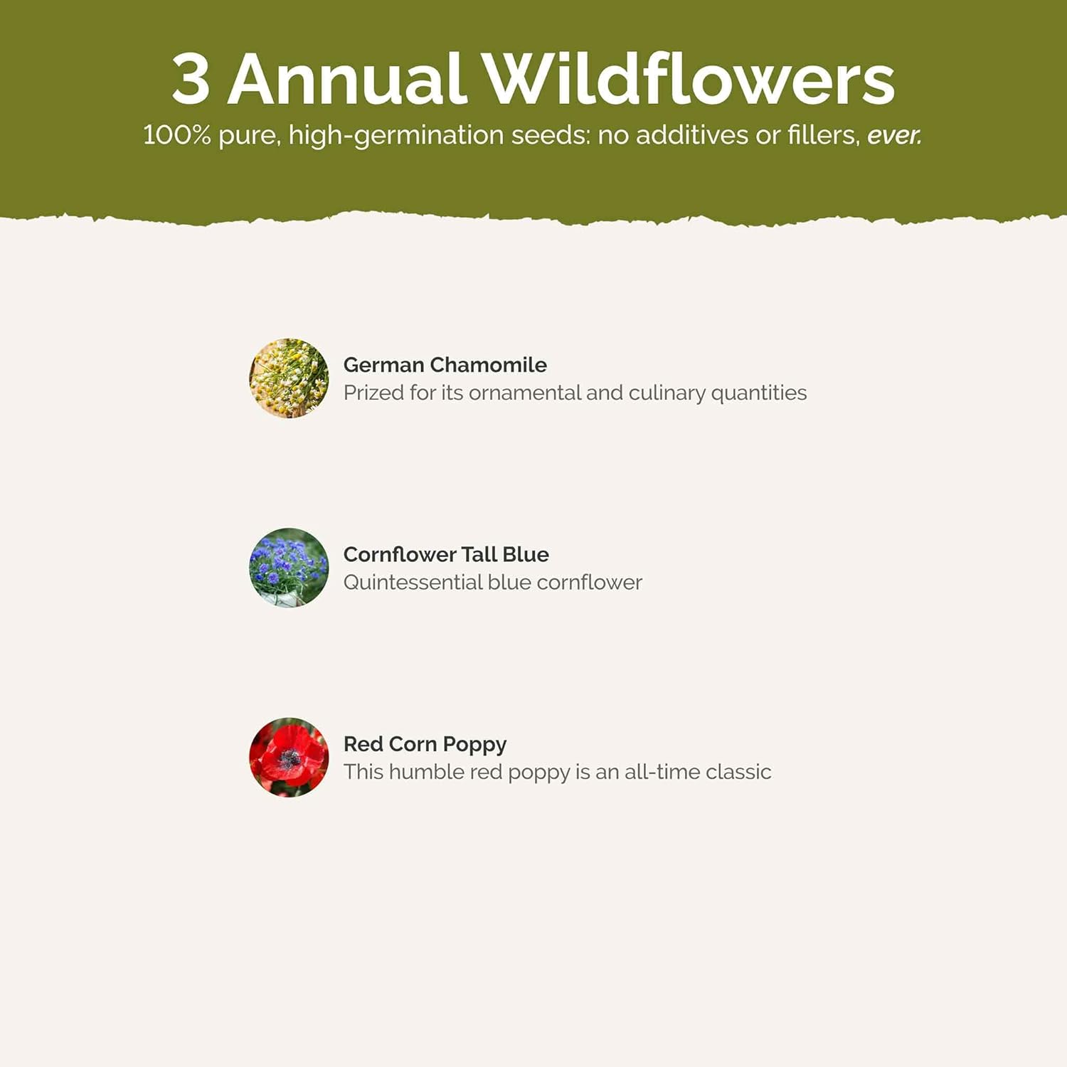 • 100% Pure, Non-GMO Seeds - No fillers, favorites only! Includes 3 easy-to-grow species: German Chamomile, Cornflower and more