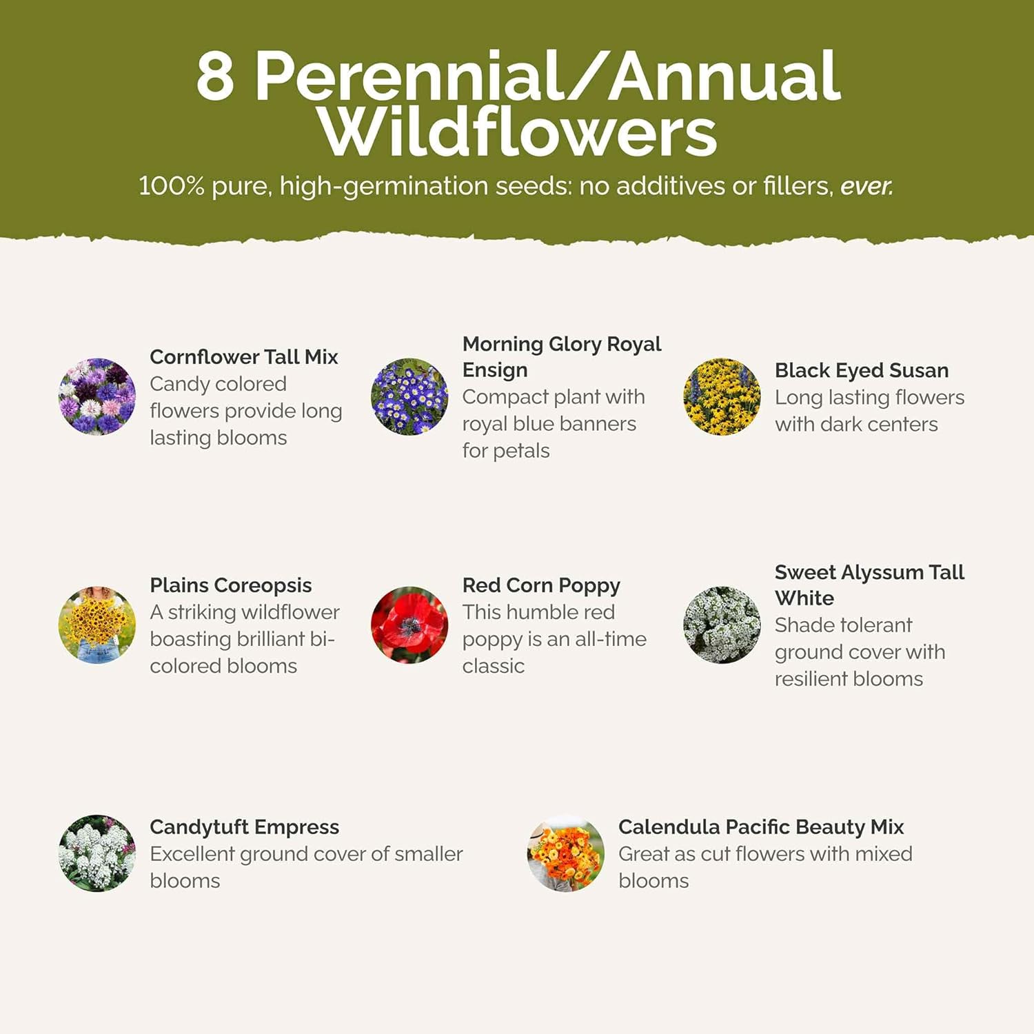 • 100% Pure, Non-GMO Seeds - No fillers, favorites only! Includes 8 easy-to-grow species: Cornflower Mix, Morning Glory Mix, Black Eyed Susan Mix, Coreopsis Mix, Sweet Alyssum, Candytuft