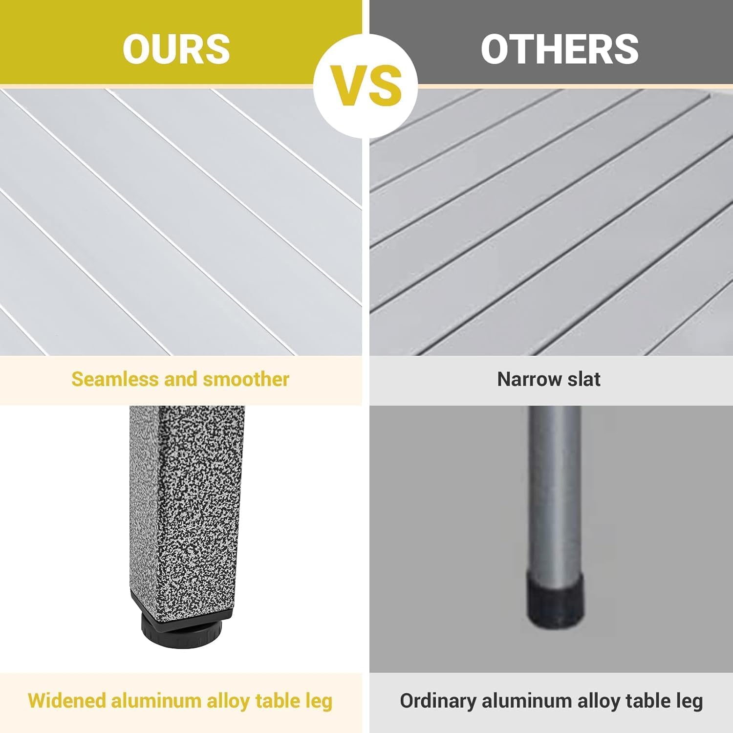 • 【Durable Roll Up Aluminum Camping Table】This folding camping table is constructed from thicker aluminum alloy with an anodized treatment, making it rust-free, corrosion-resistant, and easy to clean. The table top features a triangular steel structure design with metal material contact points, ensuring stable use even in rugged outdoor conditions.