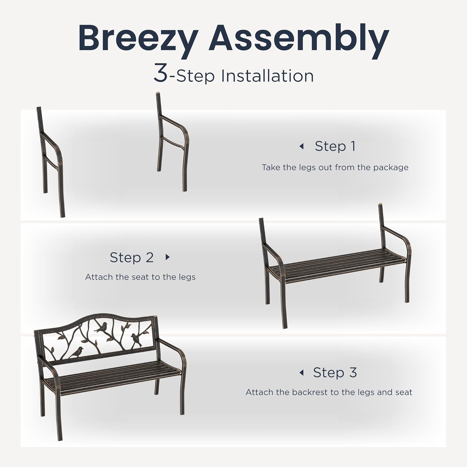 PHI VILLA Outdoor Garden Park Bench Patio 50" Metal Bench, Steel Frame Bench with Backrest and Armrests for Porch, Lawn, Balcony, Backyard and Indoor, Bronze