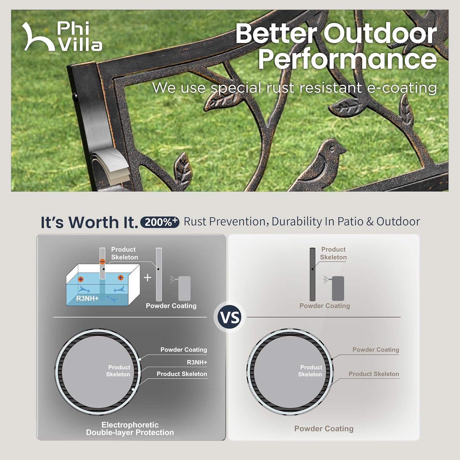 • 【Elegant Pattern】Crafted with floral pattern and wave edge of backrest,the simple but elegant look of this bench make it ideal for any outdoor space.Non-slip foot caps protect the floor from scratching.The bronze-finished chair body reveals a touch of classicism.