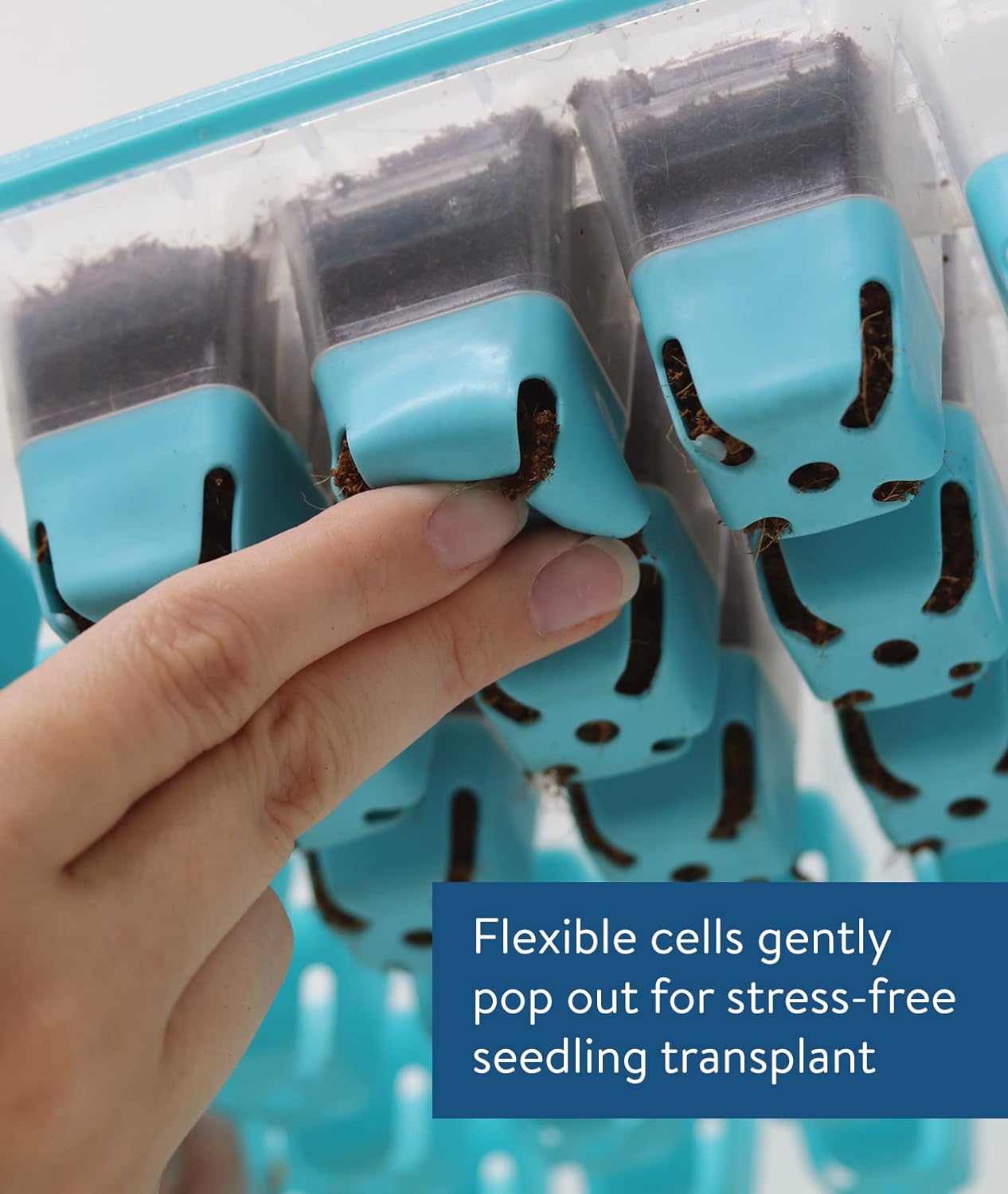• SIMPLER TRANSPLANTING: Soft food-grade silicone cells cradle seedlings and gently flex to pop out when it’s time to transplant into your outdoor garden! This system is specially designed to reduce stress on your seedlings, so you don't damage their roots. After transplanting, trays are easy to clean and reuse or simply store for next growing season. Top shelf dishwasher safe.