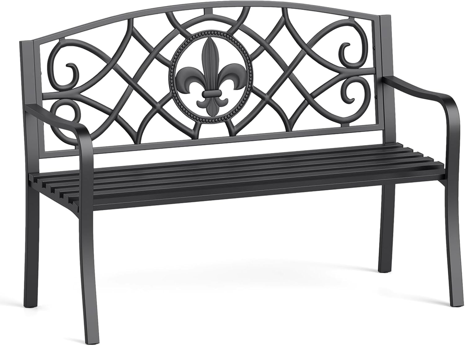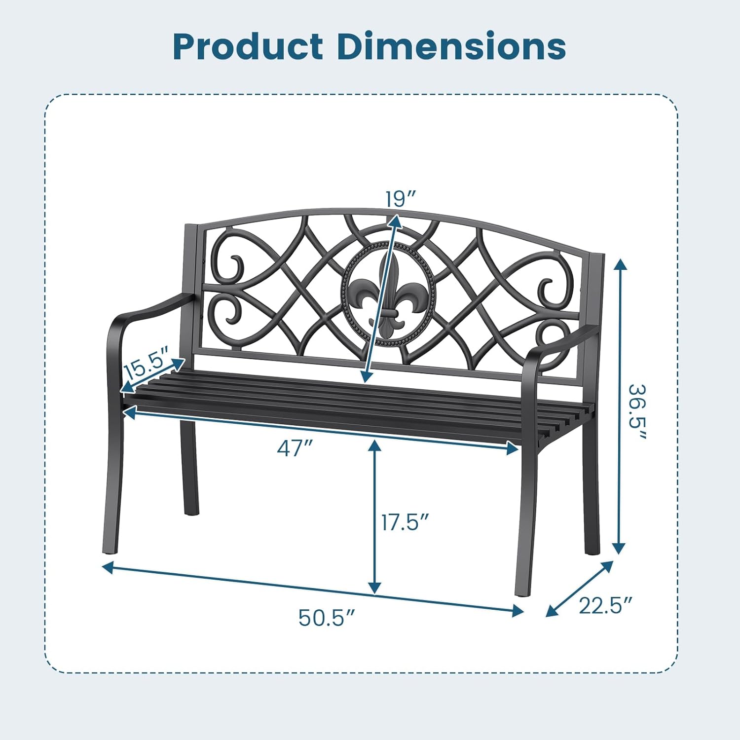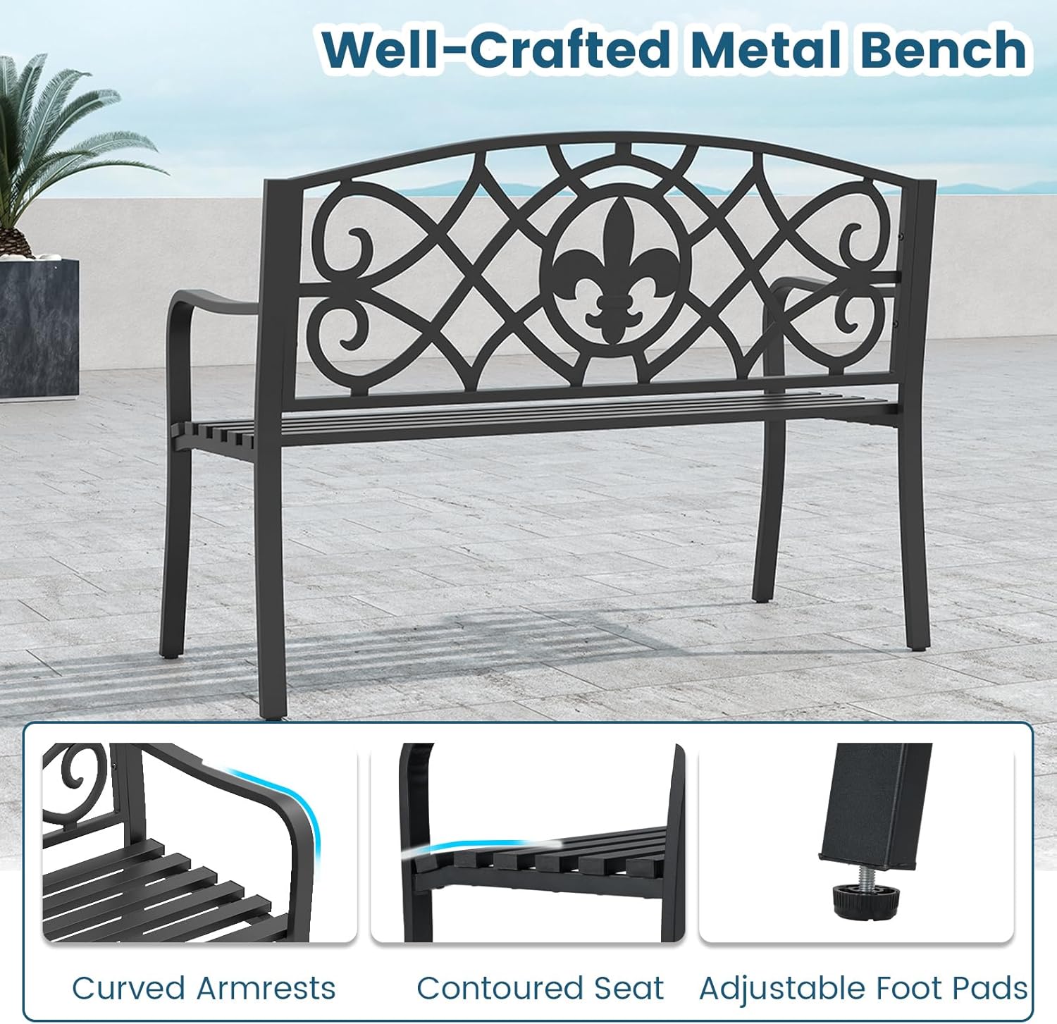 Tangkula Metal Outdoor Garden Park Bench, 50.5 Inch Metal Slatted Loveseat for 2-3 with Cast Iron Floral Backrest, Heavy-Duty Patio Seating Furniture for Backyard, Porch, Balcony