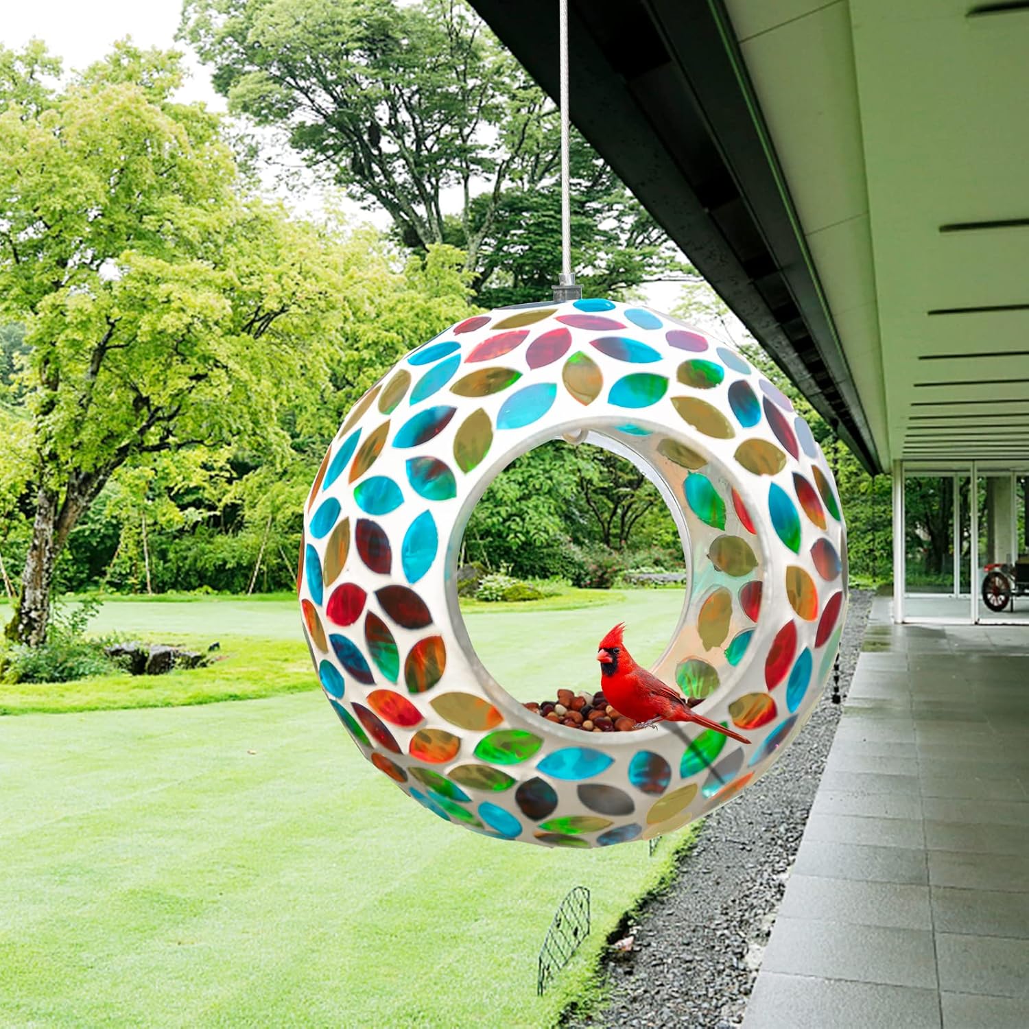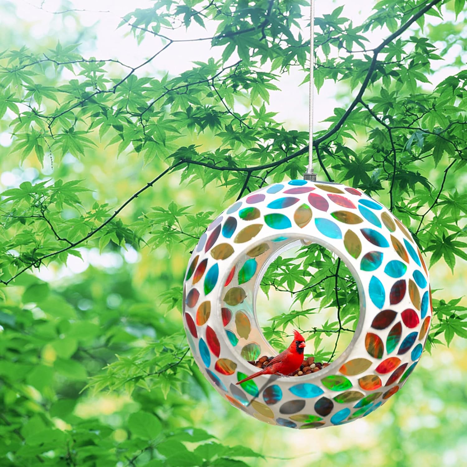 • 【Hanging Bird Feeder】Mosaic hang bird feeders for outdoors is made of strong mortar and glass. Birds can eat from the rim or hop inside during bad weather