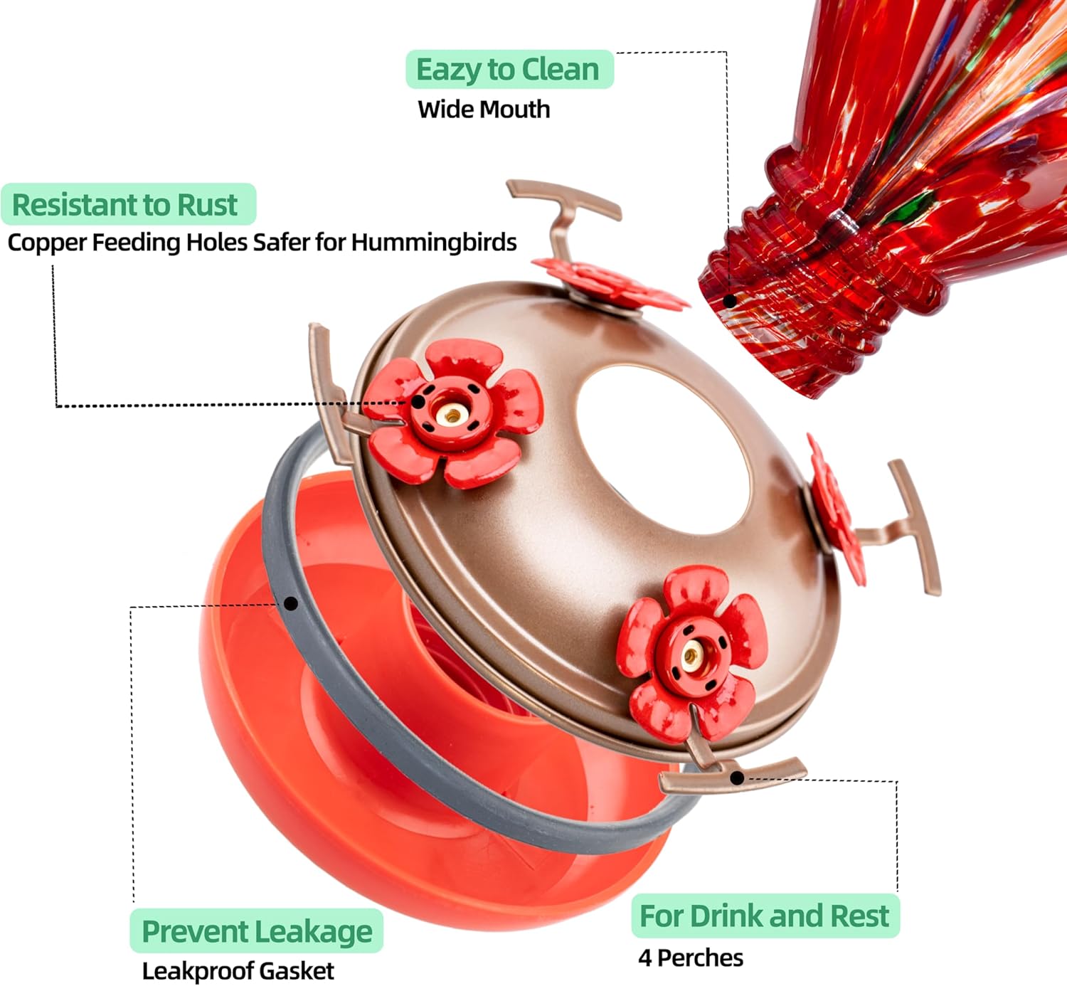 • 【Leakproof and SAFER Feeder Ports】The metal base is equipped with sealing ring and plastic basin for leakproof. UPGRADED feeder ports are made with premium copper materials, no sharp edges will cut or catch the hummingbirds' tongue. Make sure the gasket is securely attached before you hanging the hummingbird feeders outside.