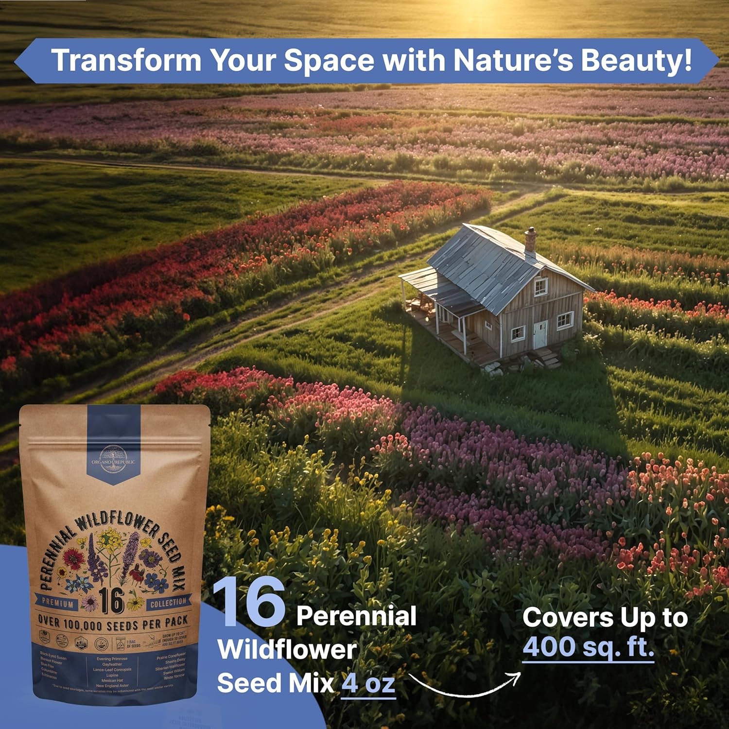 Organo Republic 16 Perennial Wildflower Seeds Mix for Indoor & Outdoors. 100,000+ Non-GMO, Heirloom Wildflower Garden Seeds, 4oz Packet for Growing Wild Flowers to Attract Bees, Butterflies & Birds