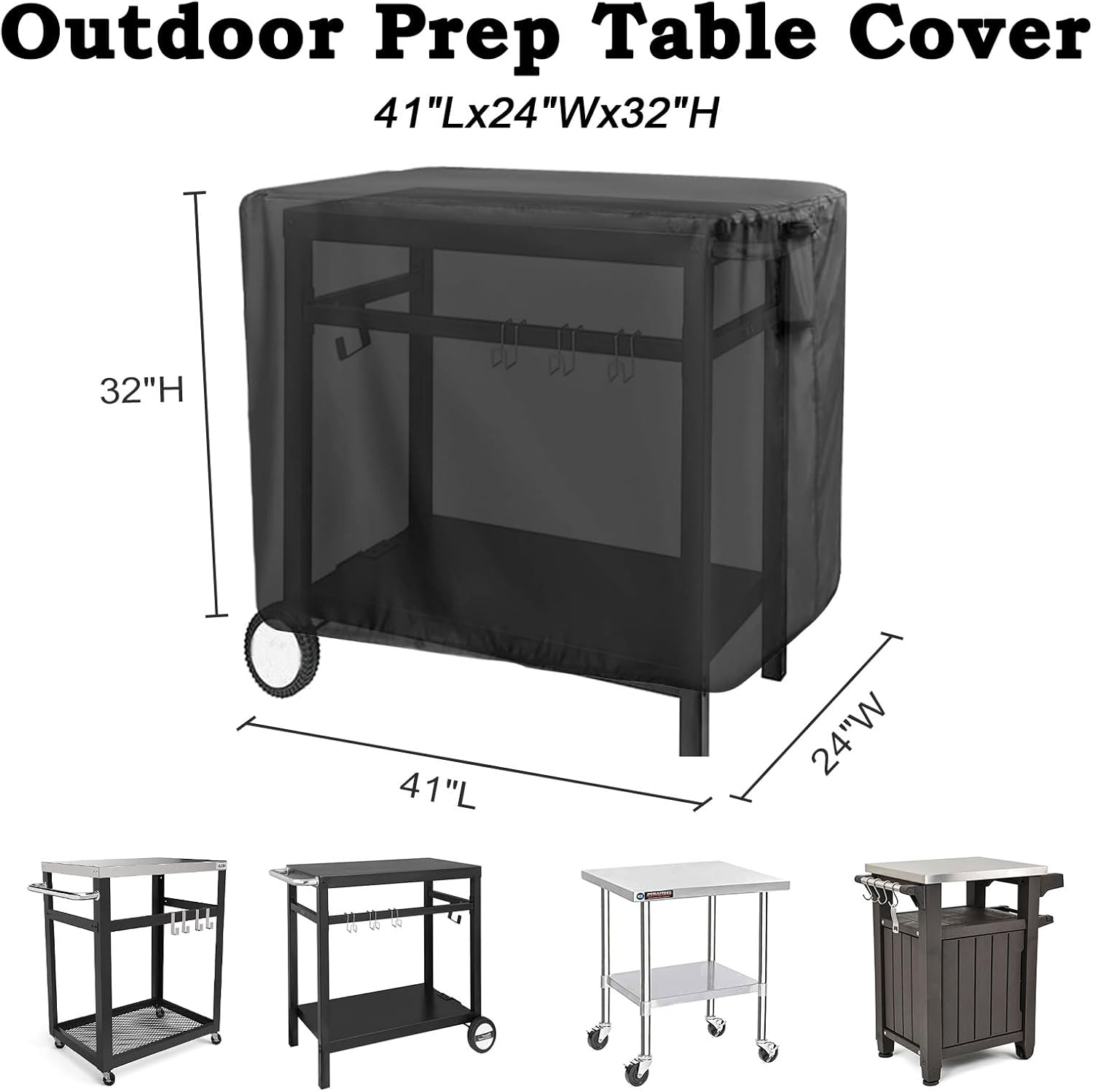 • Outdoor Dining Cart Cover Dimensions: 41" Lx24" Wx32" H; Patio prep table cover designed for Royal Gourmet double-shelf movable dining cart table PC3401B&PC3401S; Also compatible with similar size outdoor furniture, patio table, outdoor cooler cart, storage bench, outdoor bar, etc