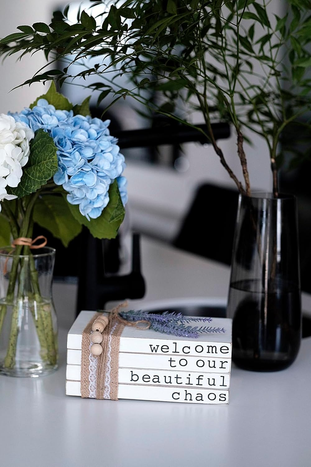 • 🎶【WELCOME TO OUR BEAUTIFUL CHAOS】-A set of 4 wooden books made from real wood, painted with premium chalk paints, wrapped in jute rope and finished with faux greenery and wood beads detail. A perfect accent piece for anywhere in your home!