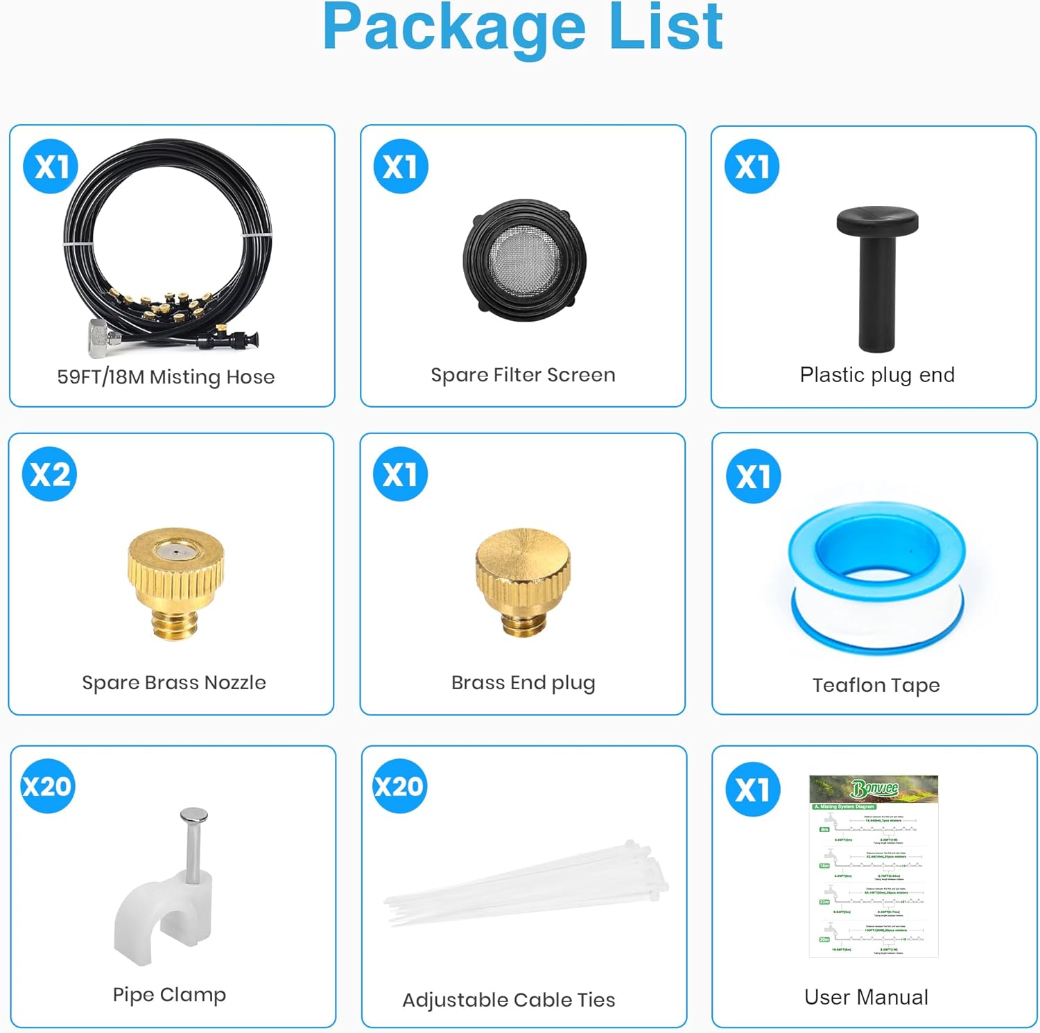 • 🌳 59FT Misting System For Medium Areas: Features 59FT (18M) tubing with 20 brass misting nozzles, perfect for medium-sized gardens, backyard dining areas, and lounging zones. Enjoy consistent and refreshing mist coverage.