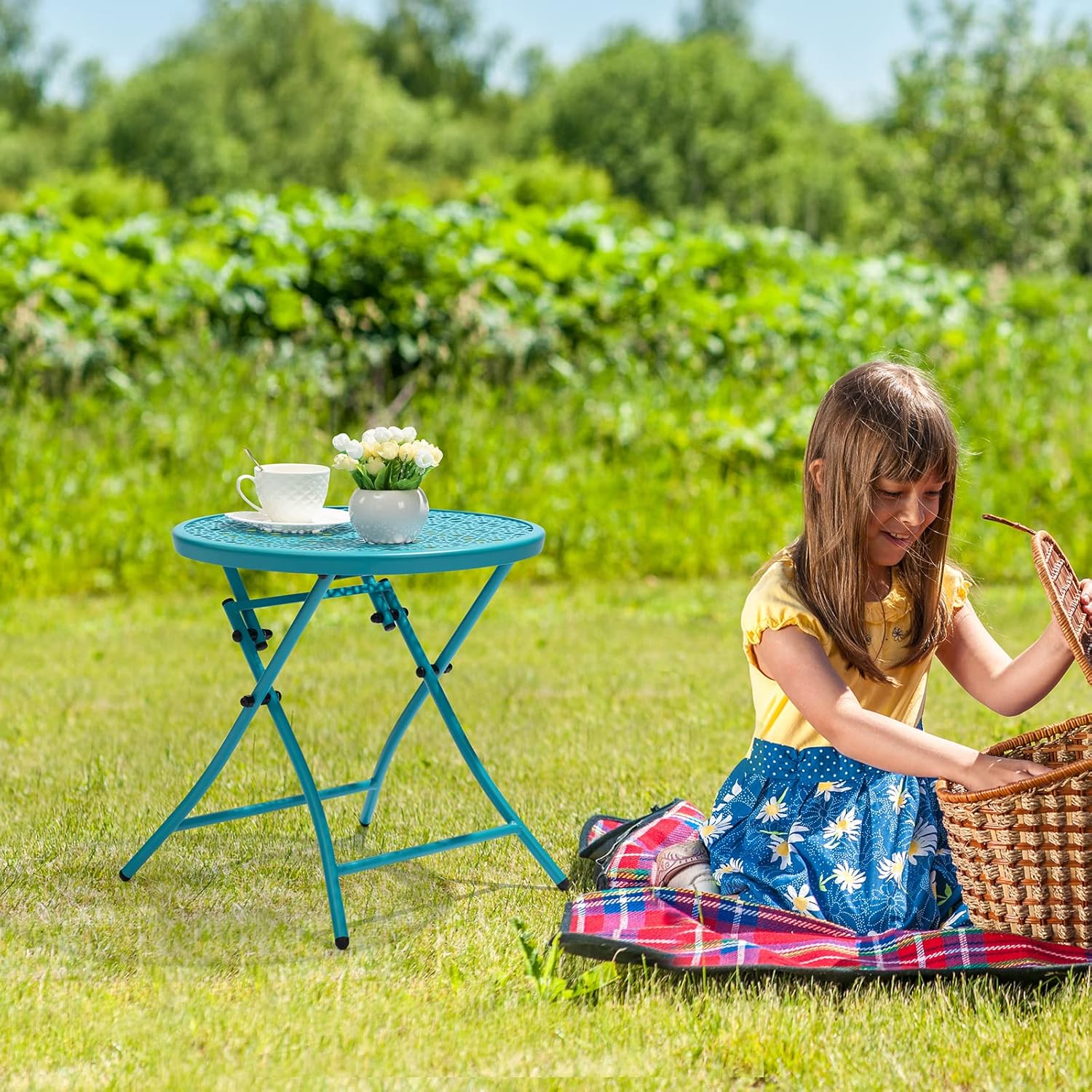 TeoKJ Folding Outdoor Side Tables, Anti Rust Small Patio Table Round Metal Nightstand with Flower Cutouts for Porch Yard Balcony Deck Lawn, Blue