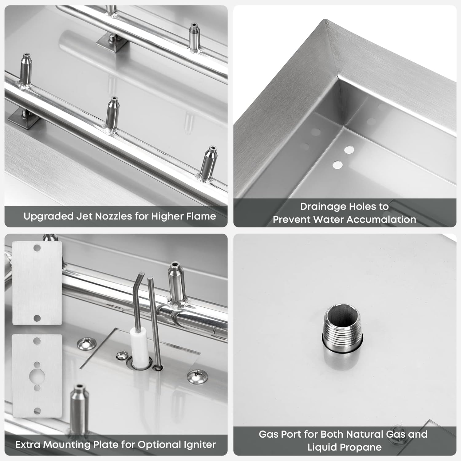 Stanbroil 30 x 10 Inch Upgrade Rectangle Fire Pit Pan with Jet Burner,304 Stainless Steel Natural & Propane Gas Firepits for Outside,High Flame,125,000 BTU Max