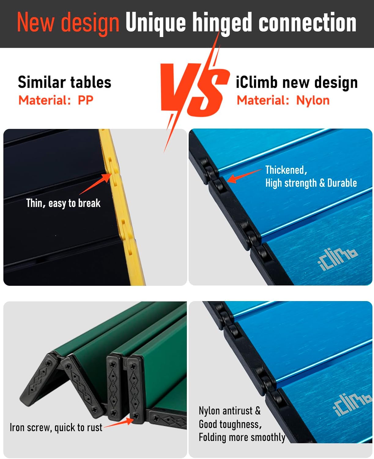 • Ultralight, made of aerospace-grade aluminum alloy, only 2.2 lbs; Max Load 66 lbs; Unlike wooden or nylon-top tables, this table is durable, waterproof, corrosion-resistant, easy to clean; Sturdy joints and anti-slip feet keep the table stable, with legs that won’t fold, bend, or slip on any terrain; Very easy to set up, just open the base frame and attach the tabletop, enjoy your leisure time in seconds, video guide available on this page.