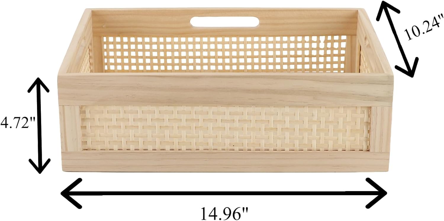 • [PREMIUM WOODEN BASKET] This wooden storage basket are made from high-quality paulownia wood with built-in handles.The angle and the surface are sanded and made firmly by craftsmen. The side face set four woven bamboo mesh, it keep basket lighter and visible from outside.