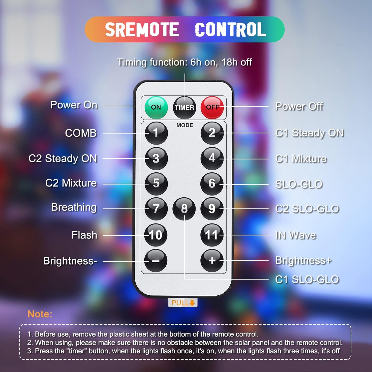 • SMART REMOTE CONTROL: Turn on/off the lights, 4-level (100%-75%-50%-25%)adjustable brightness, switch between 11 lighting modes, and timing functions on/off. All functions can be operated through remote control, which is very convenient and fast, allowing you to easily embellish your life all the time. NOTE: Please remove the insulation sheet before use, and there is no obstacle between the solar panel and the remote control.