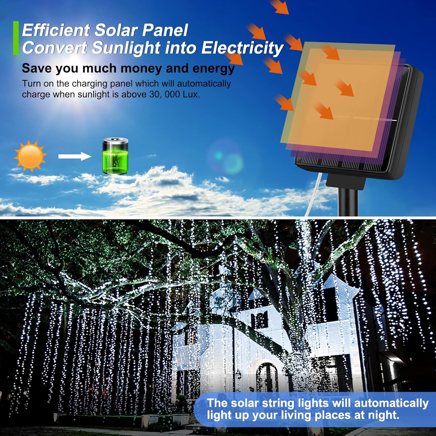 • 【Eight Romantic Lighting Modes】These solar string lights feature eight lighting modes, including steady on, combination, in waves, sequential, slow-glow, chasing, slow fade and twinkle. Different lighting settings produce different lighting atmosphere. So you could choose your preferred lighting mode to decorate your home in special festivals or brighten up the exterior of your home at night