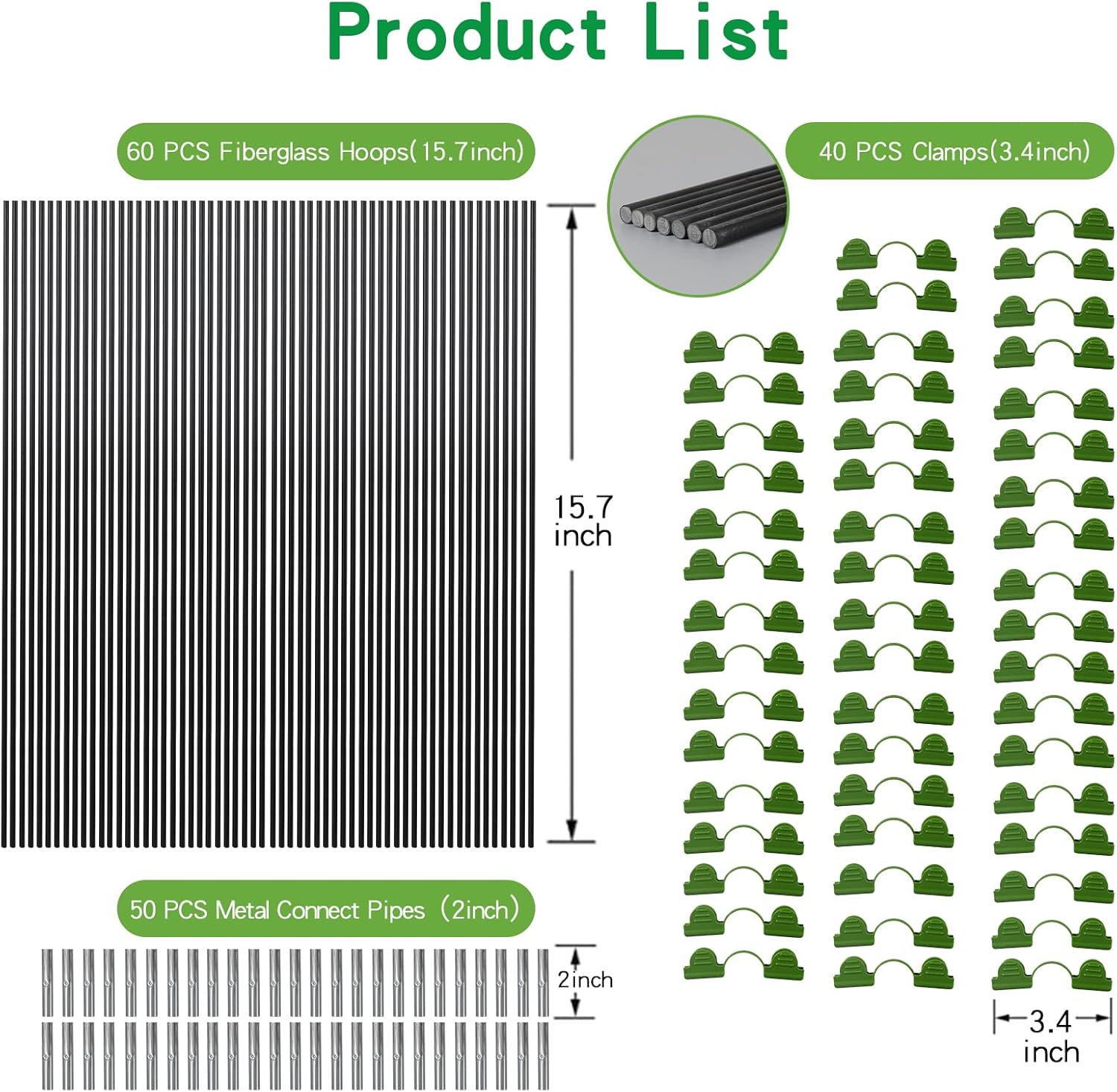 • Package: Include 60 pcs 16 Inch rust-proof fiberglass greenhouse hoops, 50 pcs 2 inch metal connect pipes and 40 pcs 3.4 inch clamps. DIY your own grow tunnel!