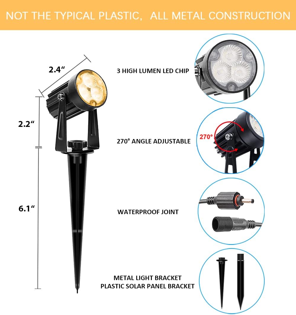 • 【2 installation methods】Easy to install:The solar panel and outdoor solar landscape lights can be installed in the ground or mounted on the wall with included screws. Each solar garden spot lights with 118inch/3m cable, 270° Adjustable freely up or down to meet different requirements