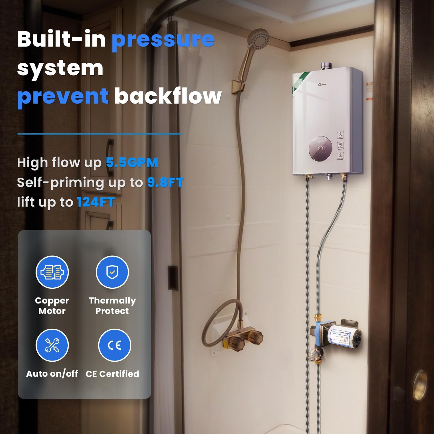 • Diaphragm Quiet Pump: The diaphragm pump use new design high-quality all-copper motor with high performance, more stable operation and less noise. Water pressure pump equipped with anti-vibration iron plate mounting bracket and rubber feet, which can reduce the working noise more greatly. Let you have a comfortable and pleasant sleep!
