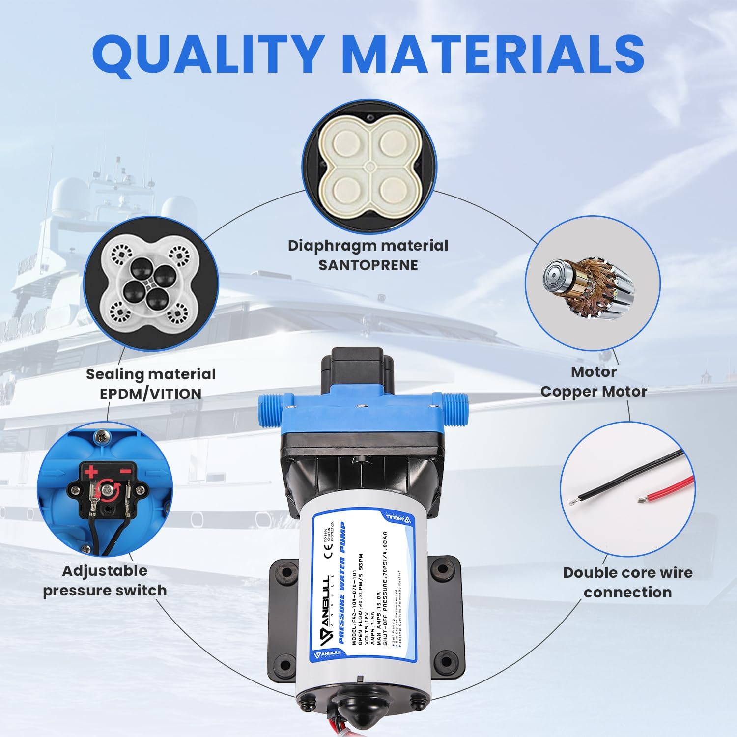 • 12V Water Pump: Voltage:12V; Open Flow:5.5GPM/20.8LPM; Pressure Setting:70PSI/4.8Bar; Outlets:1/2"-14 external thread interface; Brass Adapters:3/4"; AMPS:7.5A (Max 15A); Self-priming Height: 9.8Feet. A really high-quality 12 volt rv pump with low power consumption, high performance and strong suction.