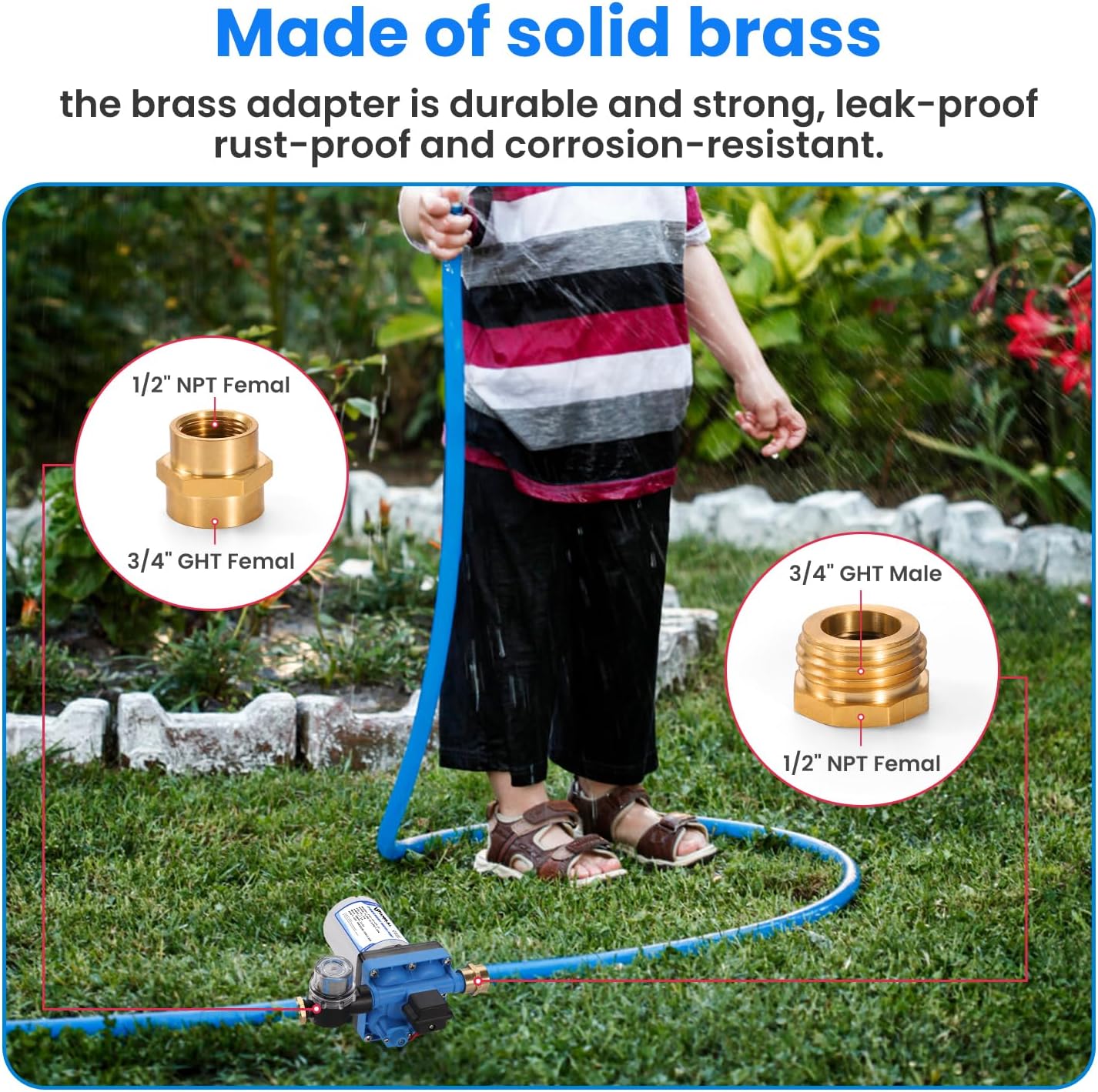 • Professional and Efficient: 1) Strong self-priming ability: The fresh water pump self-priming height up to 9.8 feet, can achieve high flow up to 5.5GPM (20.8LPM).2) Auto close/open: The camper water pump with built-in pressure switch, water supply when the faucet is opened, and power off when the faucet is closed.3) Adjustable pressure switch: Pressure enough to both washing and showering, can adjust according to your needs.