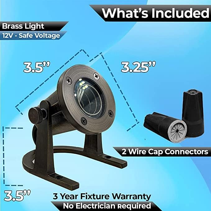 • {What's Included} Our waterproof heavy duty patio pond underwater led lights will light up your pool waterfall, outdoor pond, fountain, water statue, stream, pond rocks and add water light effect. Includes beautiful finish brass led underwater lights low voltage led landscape lighting with adjustable brass knuckle, silicone filled connectors and pre-wired with 25ft insulated low voltage cable that does not require additional piping or conduit for installation of the underwater fountain lights