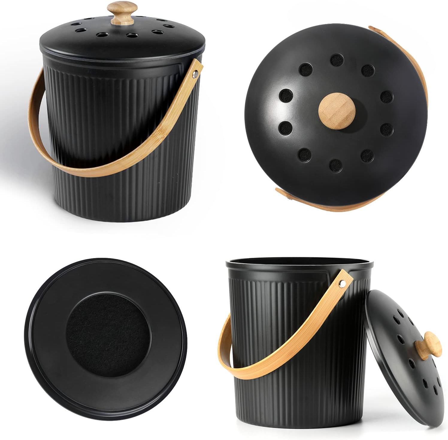 • Odorless: The counter compost bin has a vented lid and charcoal filter that absorbs and traps odors inside of the compost bucket. No worry about your kitchen smelly decomposing waste again.