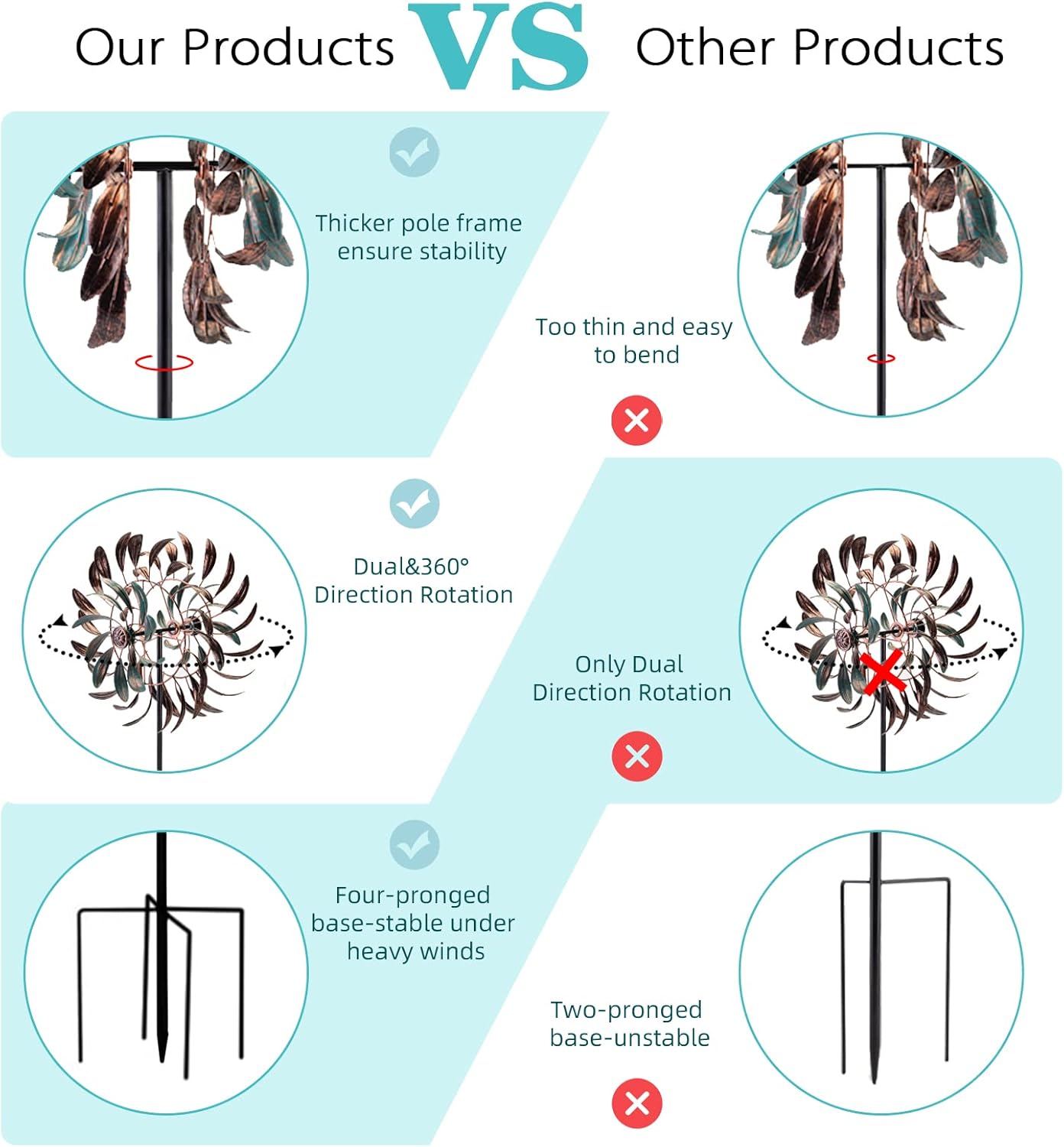 • STABLE:The metal wind spinners has a solid metallic construction with easy spinning copper blade which smoothly rotates on sealed bearings. Four-pronged at the base for extra stability