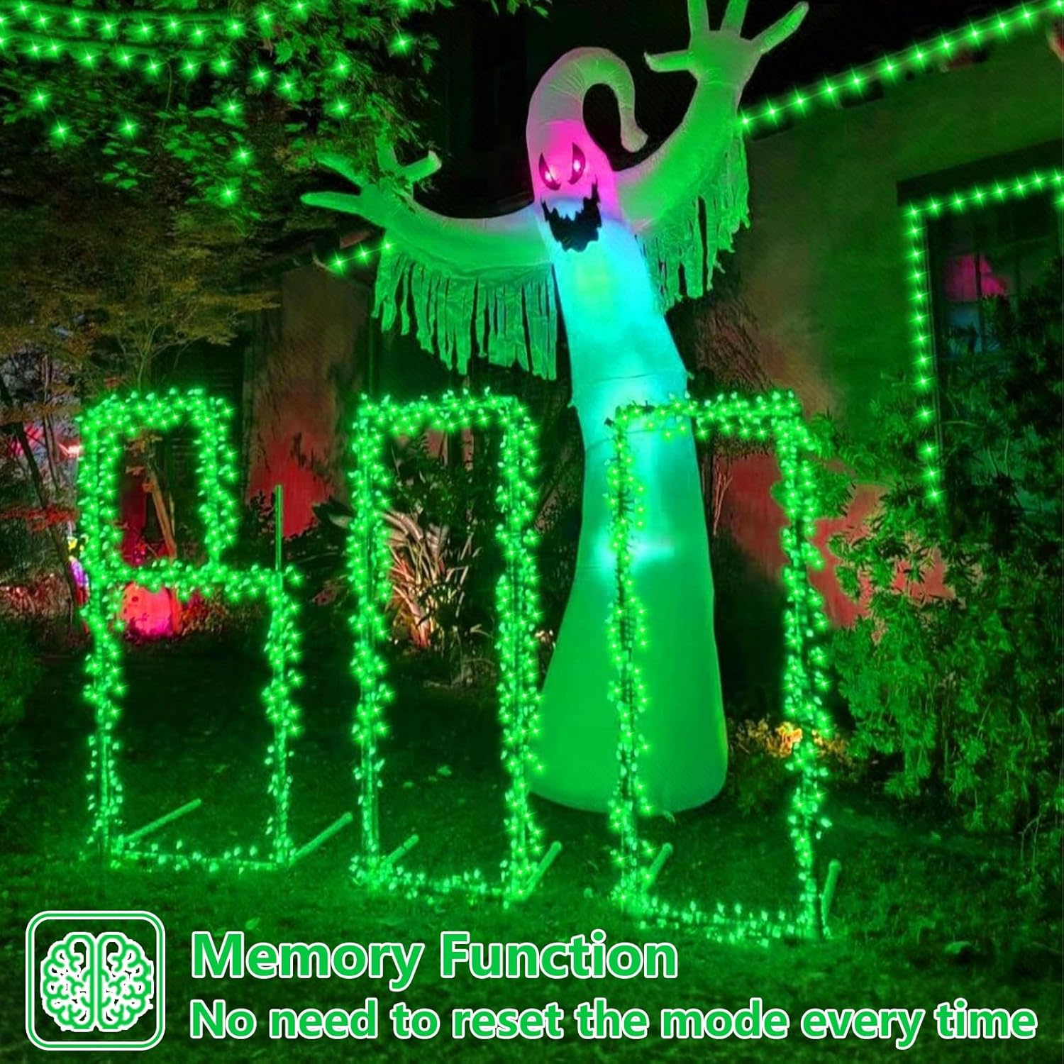 • Brilliant Outdoor Decor Lights: 2 Pack each 200 LED solar string lights with green light accent your space with a unique, inviting glow. 66ft length is perfect to put around a garden or porch railing. Green solar string lights the finishing touch for a back yard bbq, St Patrick's, Christmas, Halloween, party, wreath, fence, patio, pools, bush, holiday, indoor, outdoor. In the dark, the wire fades to invisible, leaving only the fairy lights, create a flicker and mysterious atmosphere.