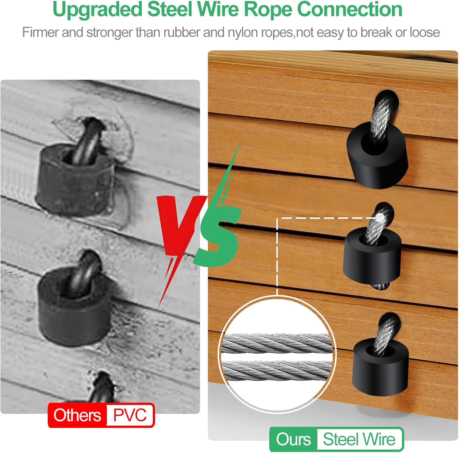 • Firm Steel Wire Rope Connection:Each plank is firmly connected with 2 rows of steel wire ropes and rubber spacers,which are more aging-resistant and anti-loosening than rubber and nylon ropes,while providing better protection to the wood surface!What’s more,this kind of connection gives the garden wooden pathway sufficient flexibility and durability to adapt to all kinds of uneven ground,like beach,grassy road,sandy road,icy road,snowy road,gravelly road,damp or muddy ground,boggy or bare areas