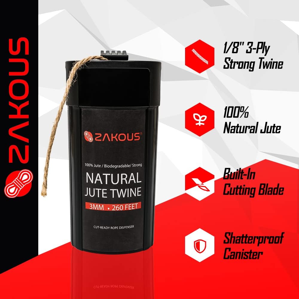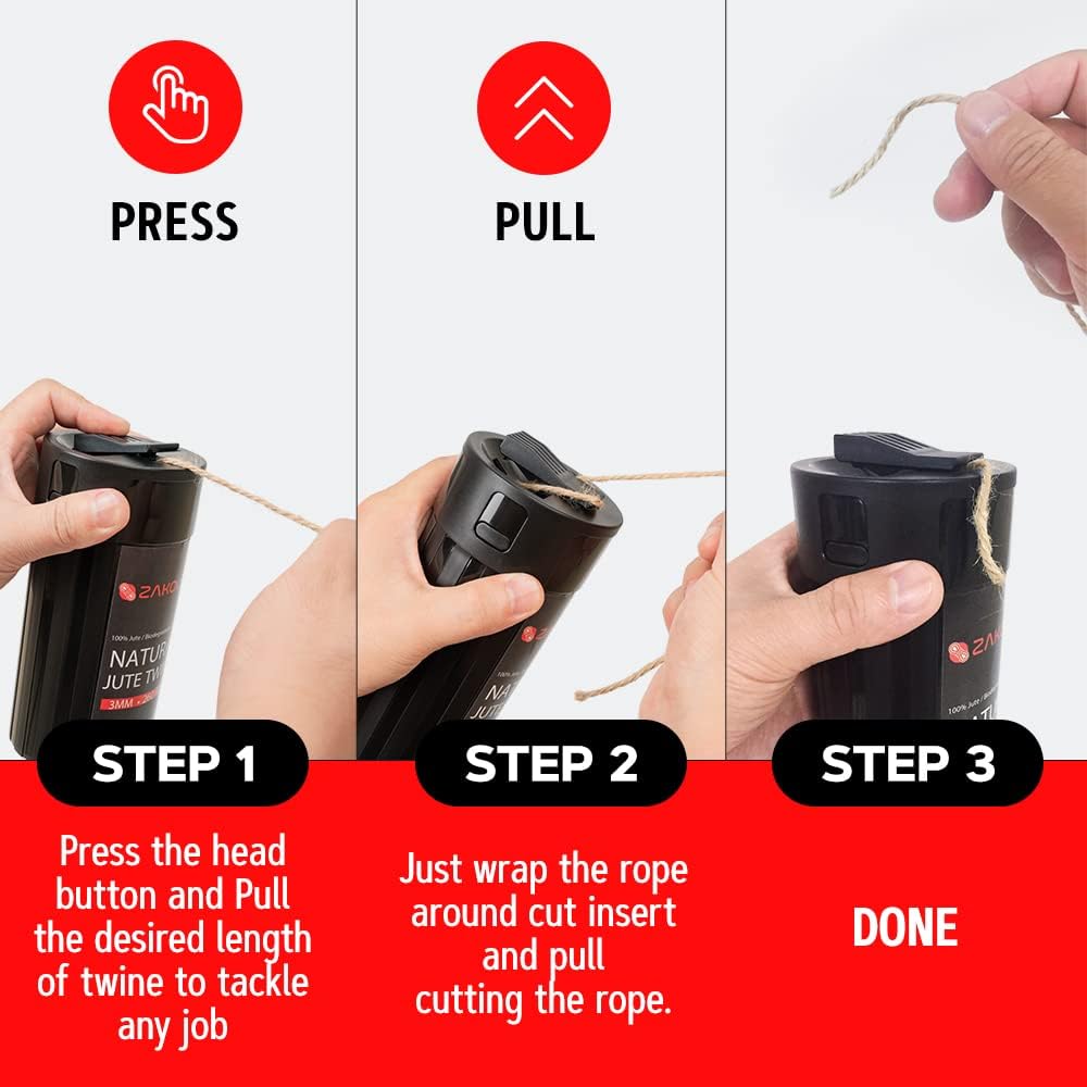• CUT READY ROPE DISPENSER: Zakous Rope Canister has a cut insert ready at all times. Pull the desired length of jute twine to tackle any job and just wrap the twine around cut insert and pull, cutting the twine