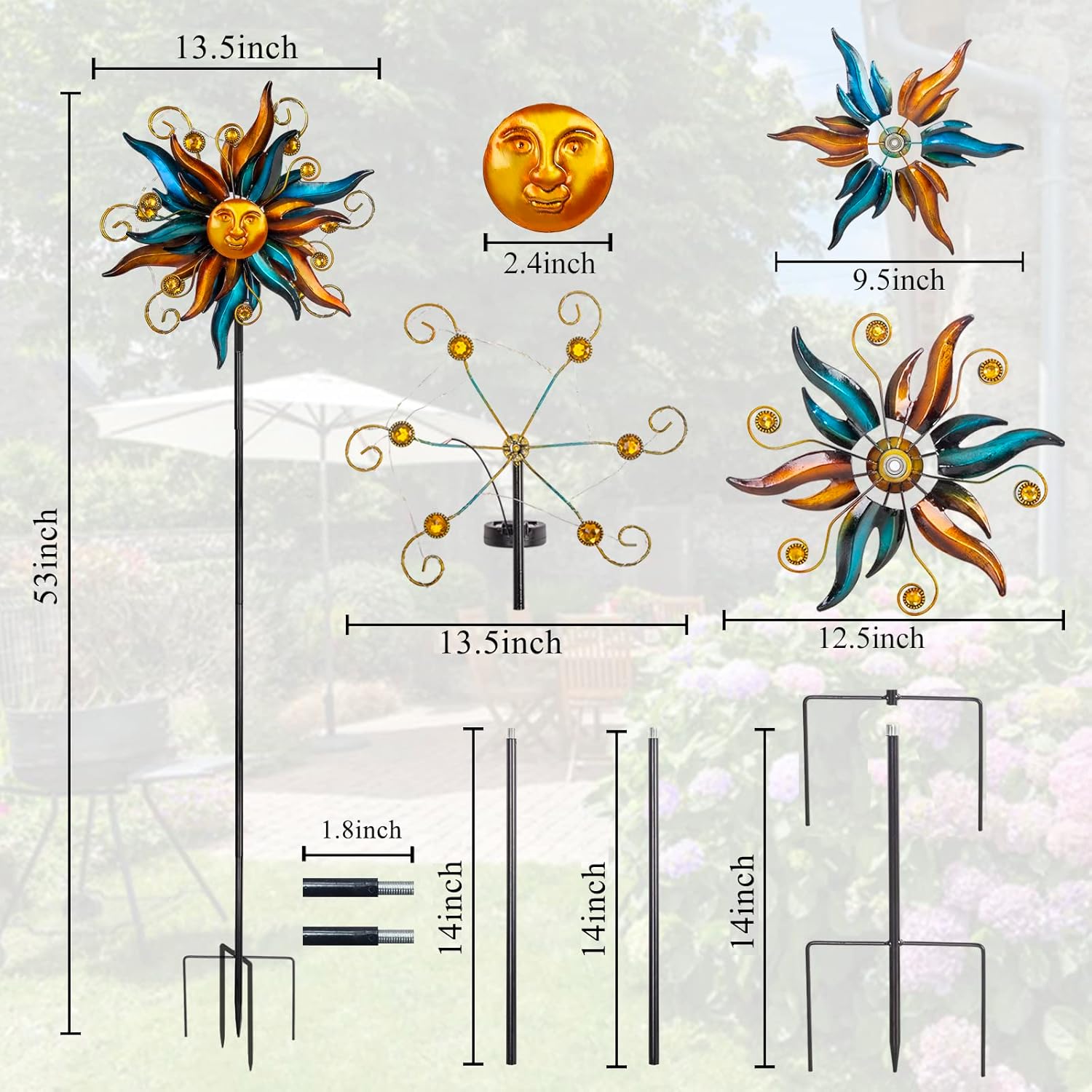 • Unique Design: Sun face wind spinner design with double "sunlight" blades and solar lights. As it spins with the breeze, shining, a bright lights on the wind spinner adds more charm to you garden