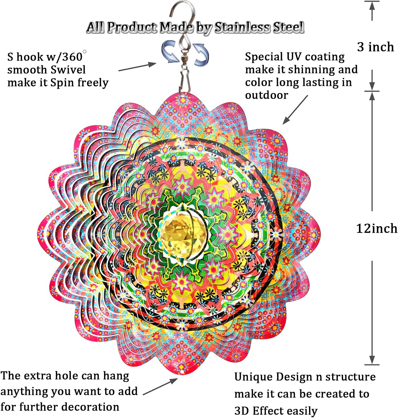 FONMY Mandala Wind Spinner w/Crystal Ball-Romatic Flower 3D Stainless Steel Hanging Spinners Worth Gift Christmas Decoration Indoor/Outdoor Garden Décor Kinetic Yard Art 12 Inches Wind Sculpture