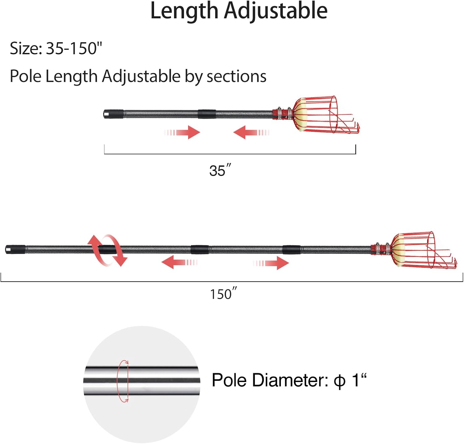 • ▼【Length Adjustable】Cherry picker tool length is adjustable by sections to be 35" to 150" which is safer and more efficient to get fruit from tall trees without falling off a ladder any more.