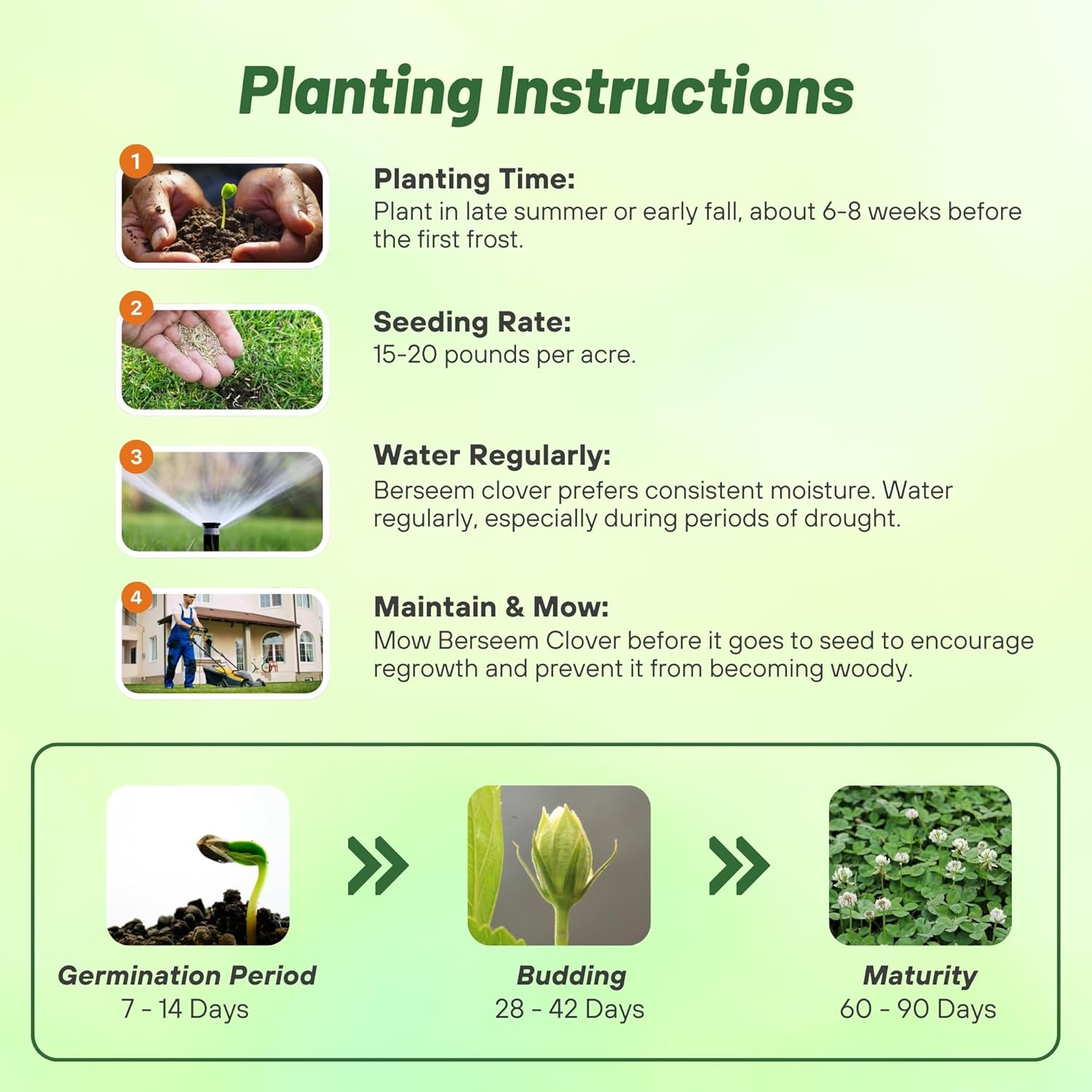 • DENSE COVERAGE WITH OPTIMAL SEEDING RATE – With a recommended seeding rate of 15-20 pounds per acre, our Berseem clover grass seed ensures thick, lush growth across fields and food plots. This high-yielding clover seed provides effective coverage, reduces erosion, and is ideal for ground cover alternatives to grass, microclover lawns, and pollinator-friendly gardens.