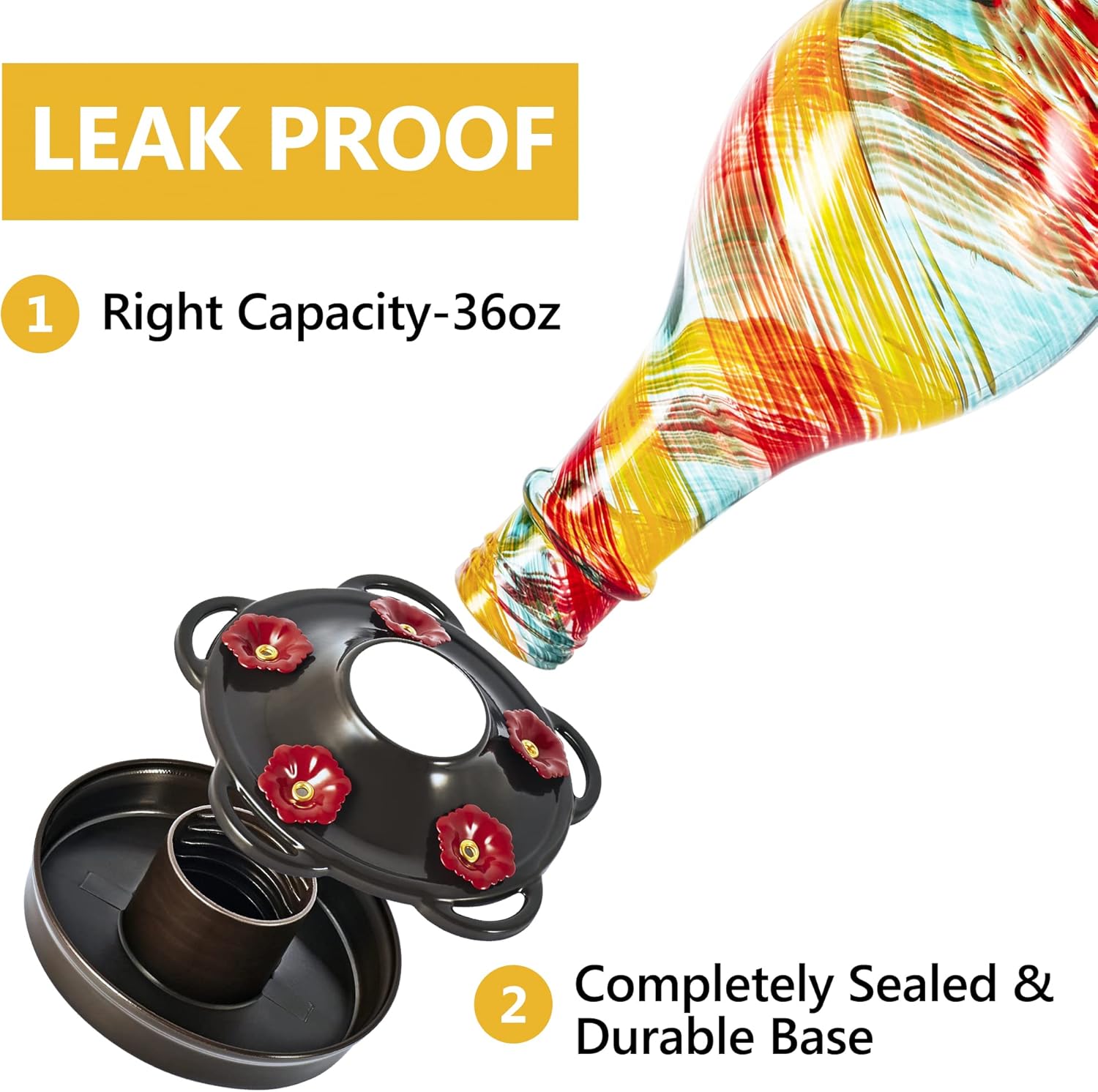 • LEAK PROOF: This vintage glass hummingbird feeder features a convenient 36 fluid ounces capacity, a slender shape and a completely sealed base that has the least leaking, drips and spills