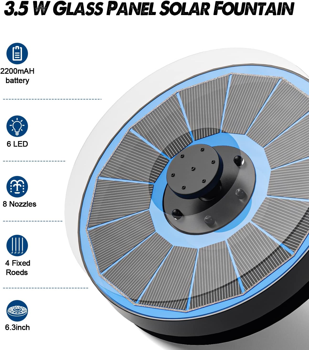 • Anti- Drift Design: The package comes with a 6.3 inch solar fountain, 8 nozzles, 4 *5 fixed rods and 3 filter cotton; Do you worry about the solar fountain swing around the birdbath and spray outside? The fixed rods are better prevent the solar fountain from moving randomly; With 8 nozzles, you and your family can enjoy 8 fountain style; Solar bird bath fountains perfect for pond, pool, outdoor, patio, garden decoration, kids playing and animal drinking