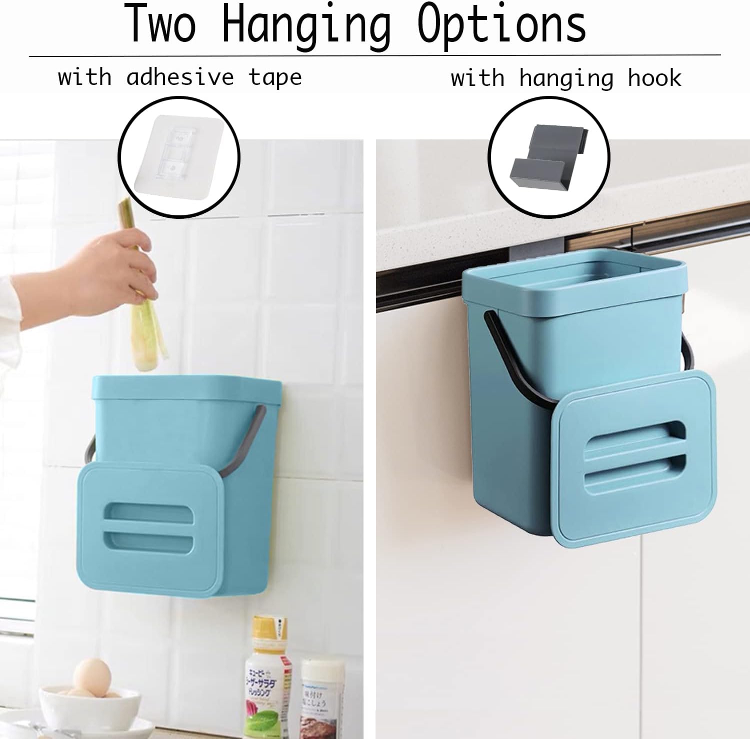 • Wall Mount/Under Sink/Countertop Trash Can: The small trash can could be easily hung on kitchen cabinet doors, pantry doors. (The thickness of the door should be less than 0.86 inch) Moreover, this food waste basket can also be wall-mounted to under sinks, cupboard, kitchen wall or bathroom wall with adhesive pad or screws.