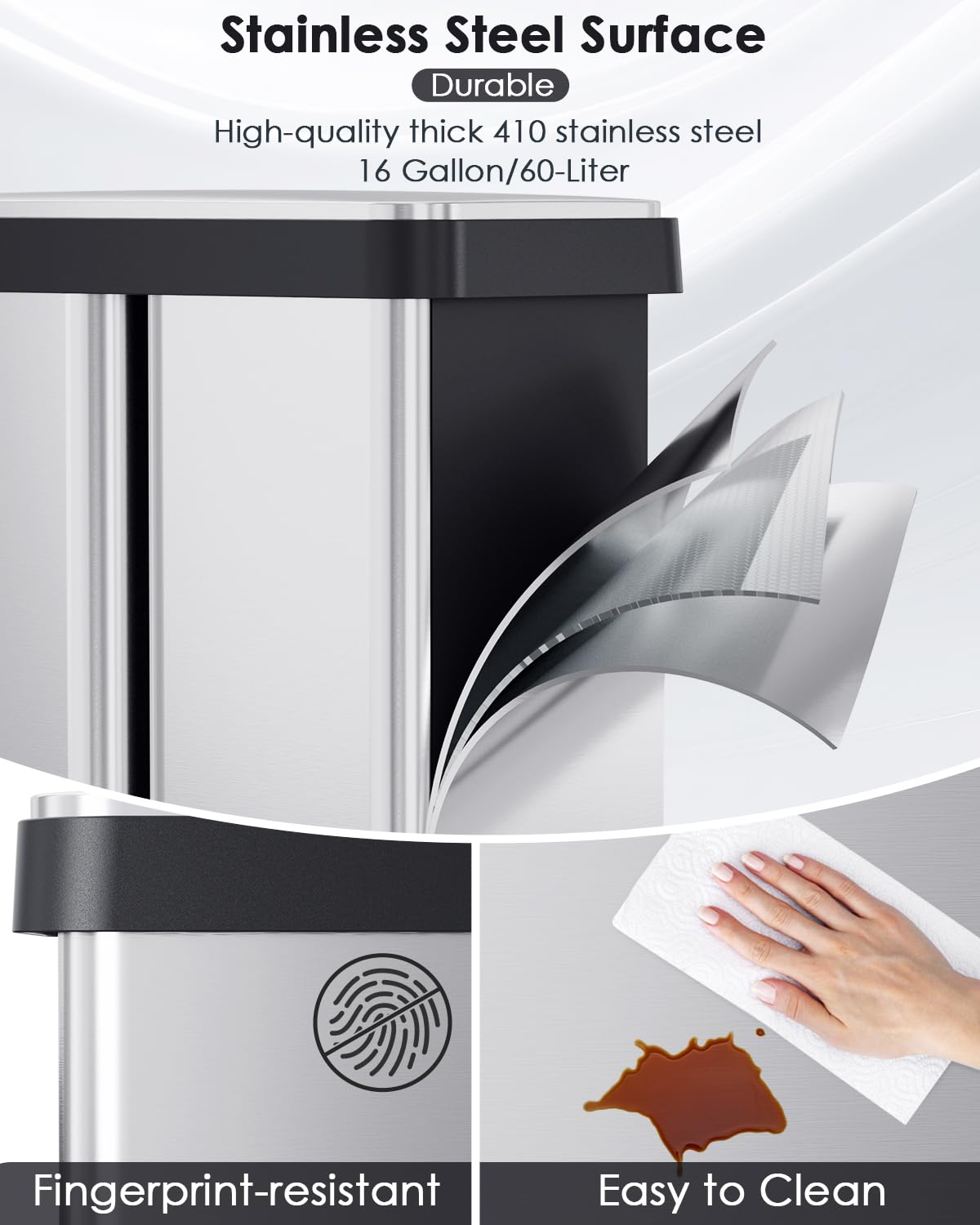 • 【Durable & Smooth】Made of thick 410 stainless steel is durable enough that can use for years. Smooth surface that won't be left a fingerprint and is also easy to clean, just wipe with a damp rag daily to keep your garbage can shiny.