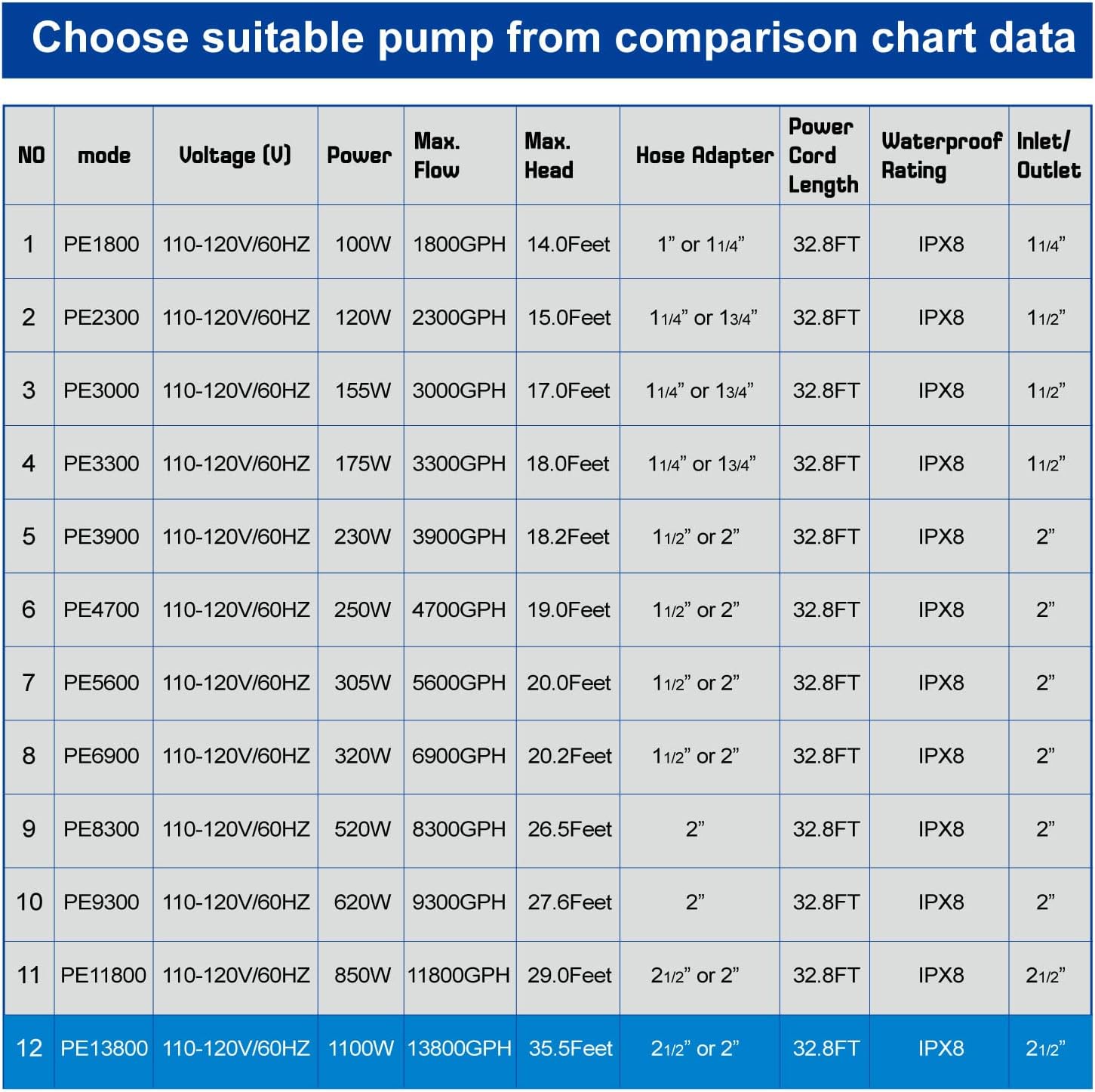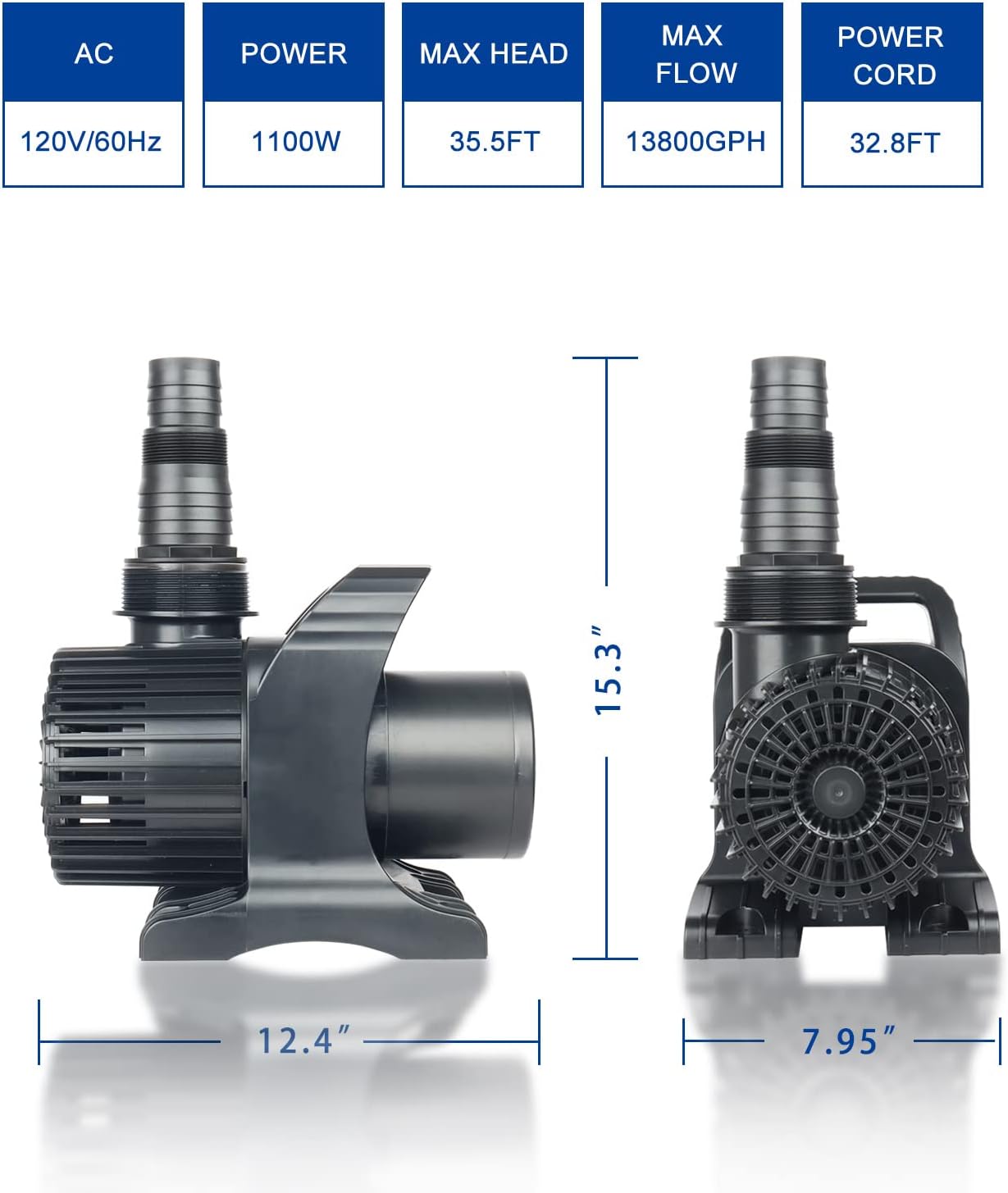 • 【Cuter & Stronger Water Flow】-AS CLEAN AS “ SPIRIT LIVES IN US"-Smarter &Powerful & QUIET pond pump, as "In quietness is your strength": 13800gph pond water-fall pump submersible outdoor is very powerful with 13800gph high flow and 35 feet high lift.It can move a larger volume of water to build water flow of waterfall or fountain in yard. although pond water-fall pump submersible outdoor is powerful, doesn’t make much noise at all, when pumping except for the soothing sound of splashing water