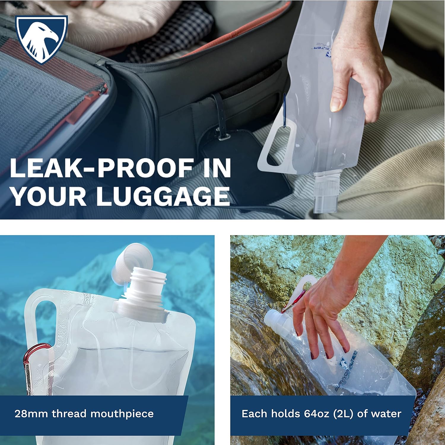 • Collapsible Water Bottle - Ideal collapsible water bottles for traveling. Each leak proof canteen can attach to any portable water filter with a 28 mm thread and holds 66oz (2L) of water.